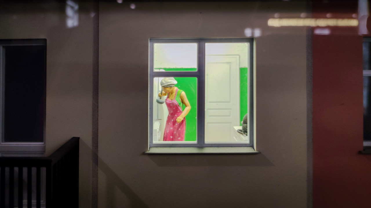 На фото представлена диорама кухни в жилом доме, входящем в экспозицию павильона «АТОМ» на ВДНХ. Через окно видна миниатюрная фигура женщины в фартуке, наклоняющейся над плитой. Стены окрашены в яркий зелёный цвет, на заднем плане находится дверь и элементы кухонного оборудования. Макет создан в рамках выставки-форума «Россия» 2023–2024 годов и иллюстрирует бытовые сцены населения городков при атомных объектах, таких как Белоярская АЭС. Фотография подходит для материалов о музейных макетах, визуальных инсталляциях и исследованиях городской повседневности.