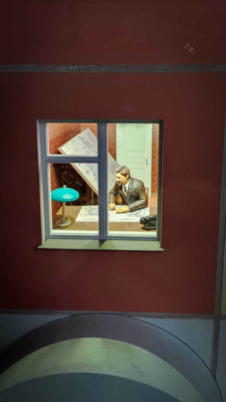 На изображении показан небольшой рабочий кабинет в диораме жилого дома павильона «АТОМ» на ВДНХ. Через окно видно миниатюрную фигуру мужчины за столом с разложенными чертежами; позади установлен наклонный планшет с техническими схемами. На столе стоит настольная лампа, рядом лежат инструменты. Сцена отображает домашнюю работу специалиста, связанных с атомной отраслью, включая инженеров городков Белоярской АЭС. Экспозиция создана в рамках выставки-форума «Россия» 2023–2024 годов. Фото подходит для материалов о моделизме, музейных экспозициях и инженерных профессиях.