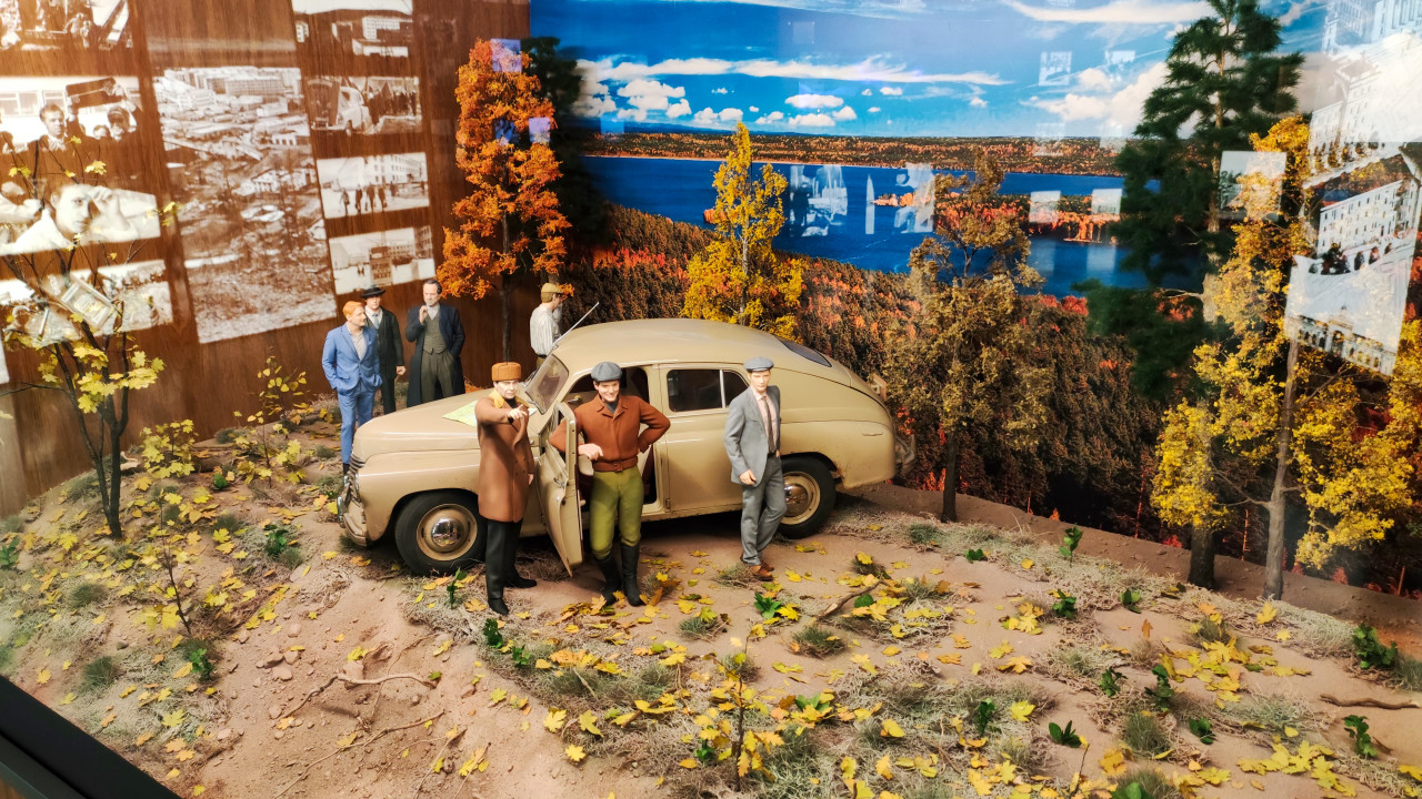 Диорама с ретро-автомобилем и группой людей в павильоне «АТОМ» ВДНХ