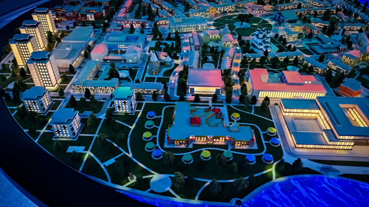 Обзорная зона макета «Атомграда» с жилыми и общественными корпусами