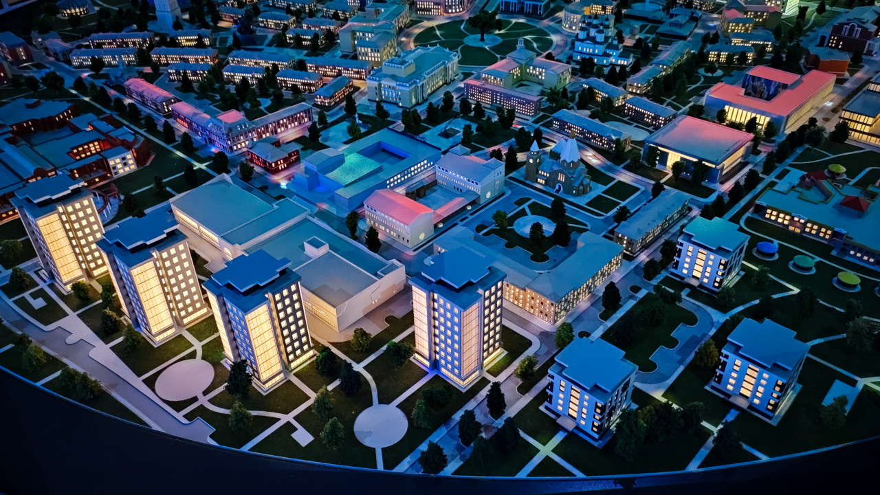 Панорамный вид макета «Атомграда» с учебными и жилыми корпусами