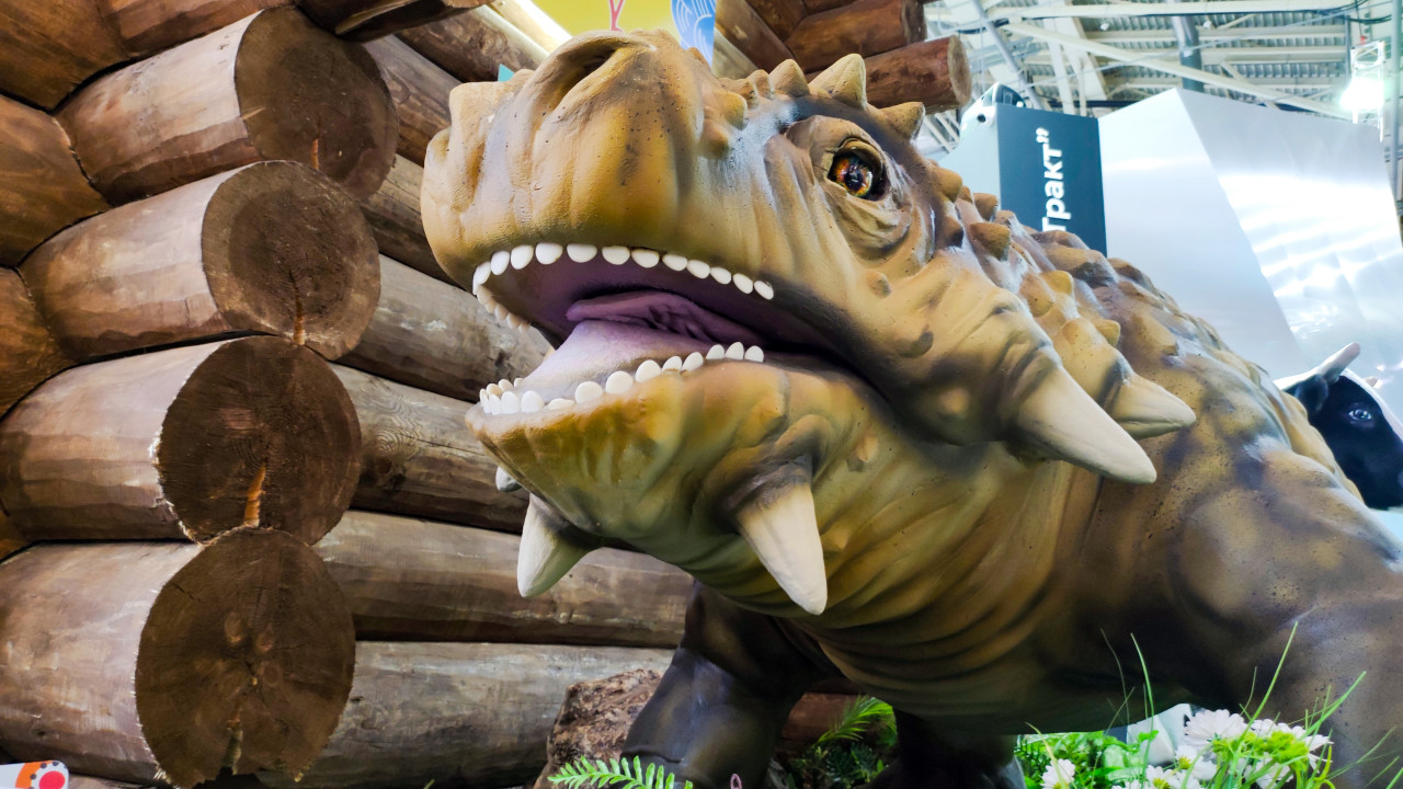 На фото показан крупный план головы полноразмерной модели парейазавра, установленной на стенде Кировской области в павильоне №75 на ВДНХ в период проведения выставки-форума «Россия» 2023–2024 годов. Видны проработанные элементы — зубы, кожные складки, шипы и окраска, а также часть деревянной конструкции, имитирующей сруб. Парейазавры известны по крупному местонахождению ископаемых остатков в Кировской области, что делает展示 этого вида логичным для регионального стенда. Снимок подходит для материалов о палеонтологии, музейных реконструкциях и региональных выставочных экспозициях.