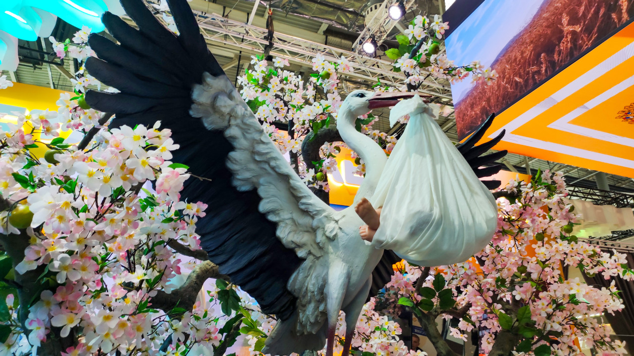 На изображении показана декоративная инсталляция аиста, держащего в клюве тканевый узел с фигурой младенца, установленная в зоне экспозиции одного из регионов на выставке-форуме «Россия» в павильоне №75 ВДНХ (2023–2024 годы). Вокруг композиции размещены искусственные цветущие ветви, а над конструкцией видны элементы потолочных ферм и светового оборудования. Сцена демонстрирует символическую тему семьи и демографии, характерную для региональных презентаций. Фото подходит для материалов о выставочном дизайне, семейной тематике и декоративных инсталляциях.