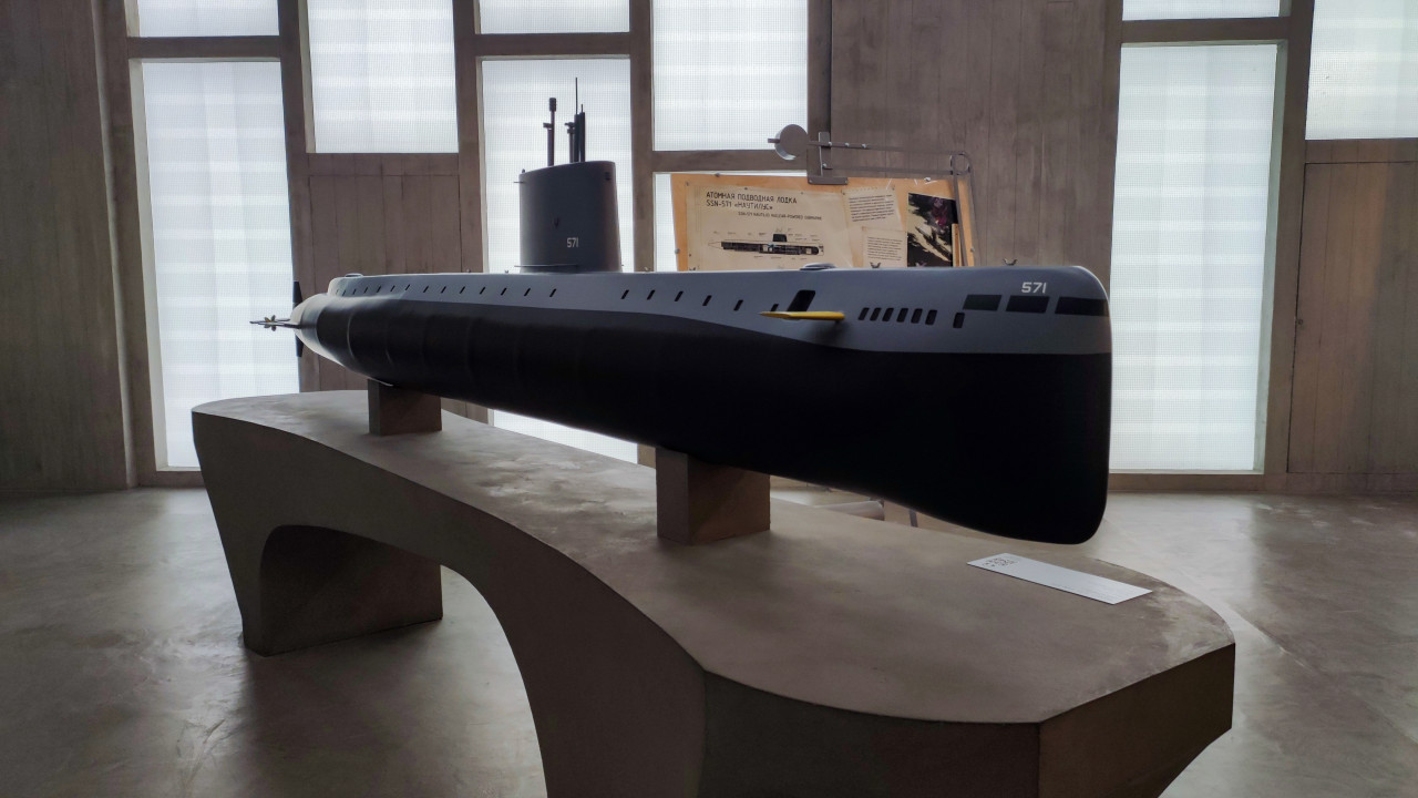 На фотографии запечатлена модель атомной подводной лодки SSN-571 «Nautilus», установленная на плавной бетонной подставке внутри павильона «АТОМ» на ВДНХ. Съёмка выполнена во время выставки-форума «Россия» 2023–2024 годов. На заднем плане находятся высокие светорассеивающие панели и информационный стенд с описанием корабля. «Nautilus» вошёл в историю как первая подлодка с ядерной энергетической установкой, совершившая в 1958 году переход под Северным полюсом. Снимок подходит для материалов о судостроении, атомной энергетике и музейных экспозициях.