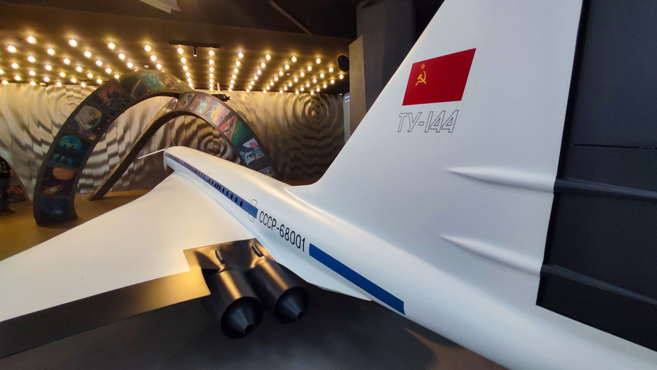 На снимке представлена хвостовая часть модели советского сверхзвукового пассажирского самолёта Ту-144, экспонируемая в павильоне «АТОМ» на ВДНХ в рамках выставки-форума «Россия» 2023–2024 годов. На киле виден флаг СССР и обозначение Ту-144, а на фюзеляже — бортовой номер CCCP-68001. На заднем плане заметна декоративная арочная конструкция с иллюстрациями и подсветкой. Ту-144 стал первым в мире пассажирским сверхзвуковым лайнером, совершившим полёт в 1968 году. Снимок подходит для материалов по истории авиации, музейных экспозиций и инженерных достижений.