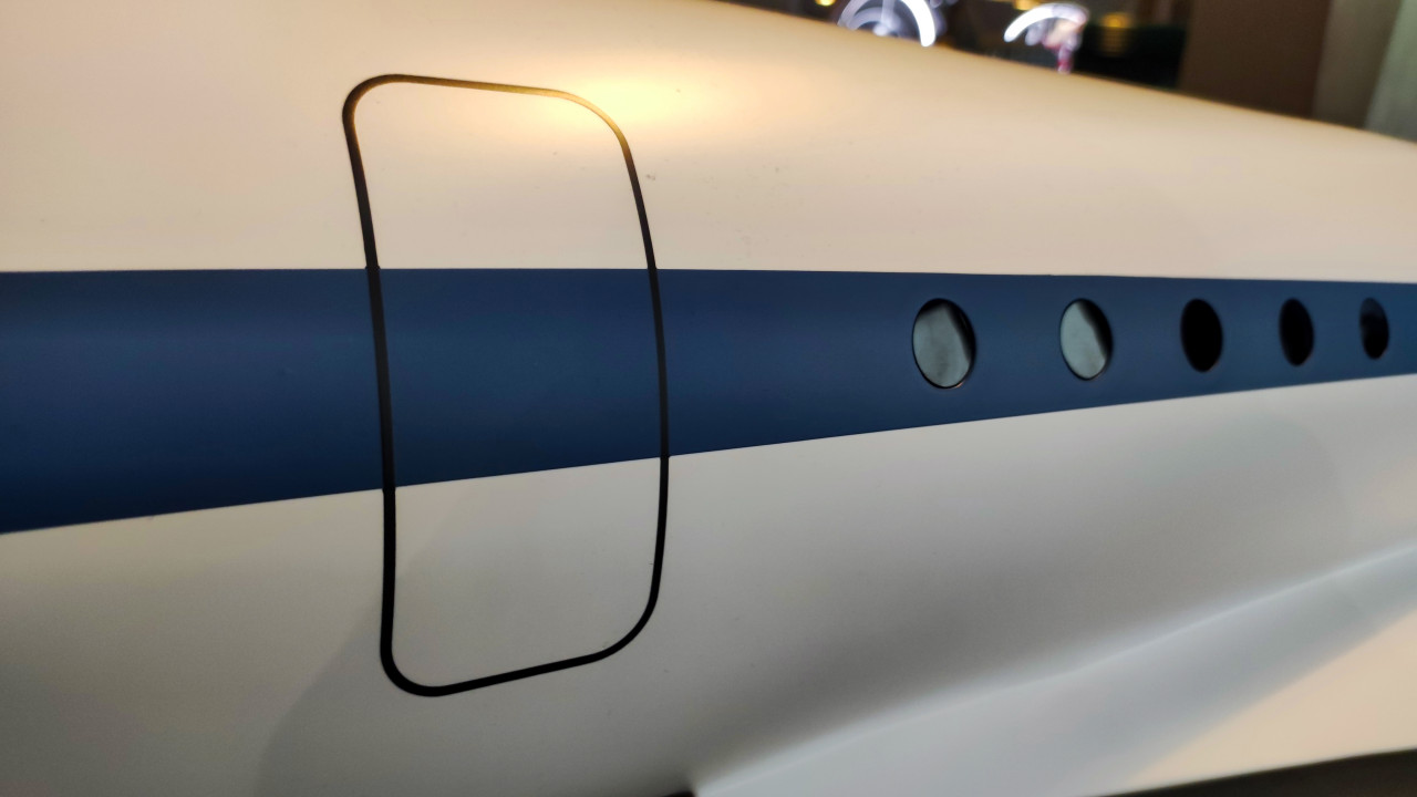 На снимке крупным планом показан участок фюзеляжа модели сверхзвукового самолёта Ту-144, выставленной в павильоне «АТОМ» на ВДНХ. Видна голубая декоративная полоса, ряд круглых иллюминаторов и контуры дверного проёма. Фон немного размытый, но различимы световые элементы и части других стендов. Ту-144 был создан в СССР в 1960-х годах и стал первым пассажирским самолётом, способным преодолевать звуковой барьер в регулярных полётах. Фото подходит для материалов о дизайне авиации, инженерии и музейных экспозициях.