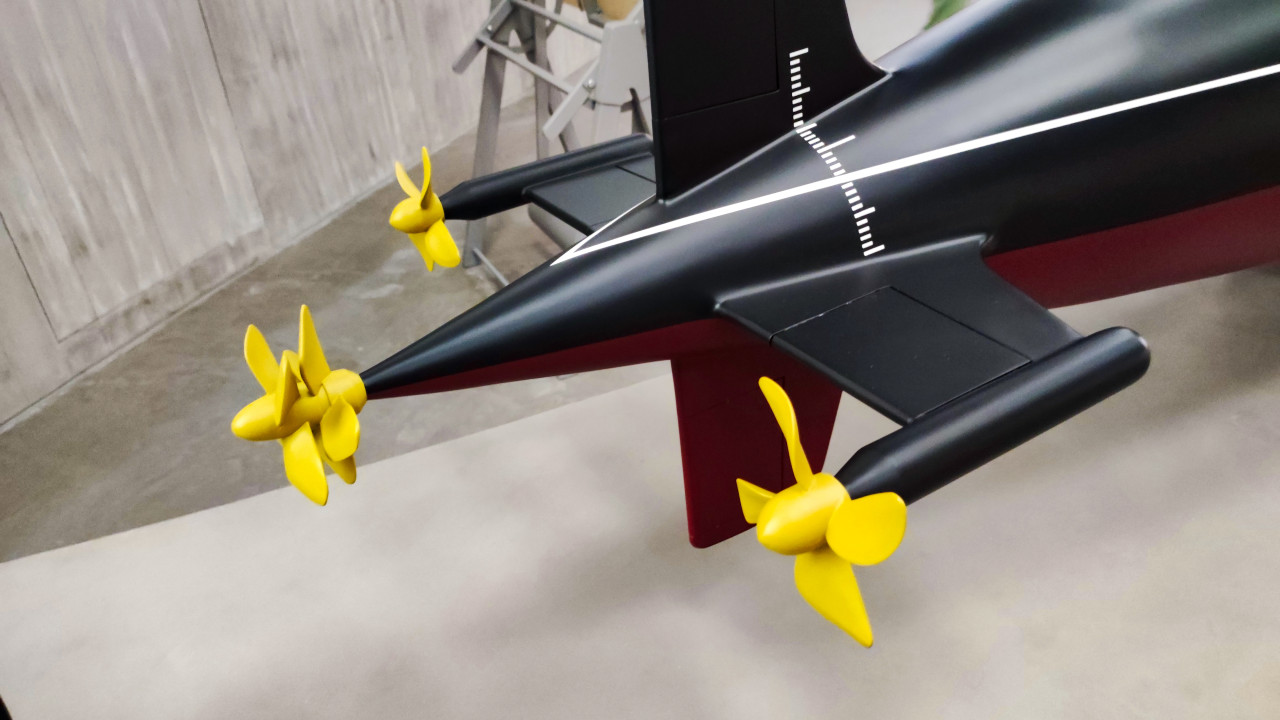 На снимке показаны жёлтые винты и хвостовые рулевые элементы модели подводной лодки, установленной в павильоне «АТОМ» на ВДНХ. Видны пересекающиеся белые разметочные линии, корпус модели и часть подиума, имитирующего морскую поверхность. Фото отражает инженерные особенности конструкции подводных кораблей и подходит для публикаций о морской технике, моделировании и музейных экспозициях.