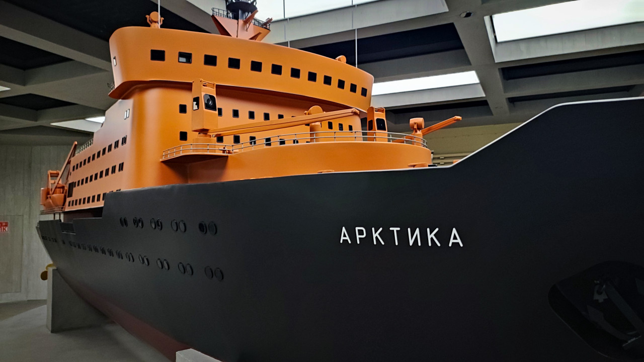 На фотографии запечатлён нос макета атомного ледокола «Арктика», выставленного в павильоне «Атом» на ВДНХ в рамках экспозиции «Время первых». Видны массивный чёрный корпус, ярко-оранжевая надстройка, палубные детали и надпись «Арктика» на борту. Этот ледокол, спущенный на воду в 1972 году, стал первым надводным судном, достигшим Северного полюса, и является значимым объектом истории советского атомного флота. Фото подходит для материалов об арктическом судостроении, инженерных технологиях и музейных展示.