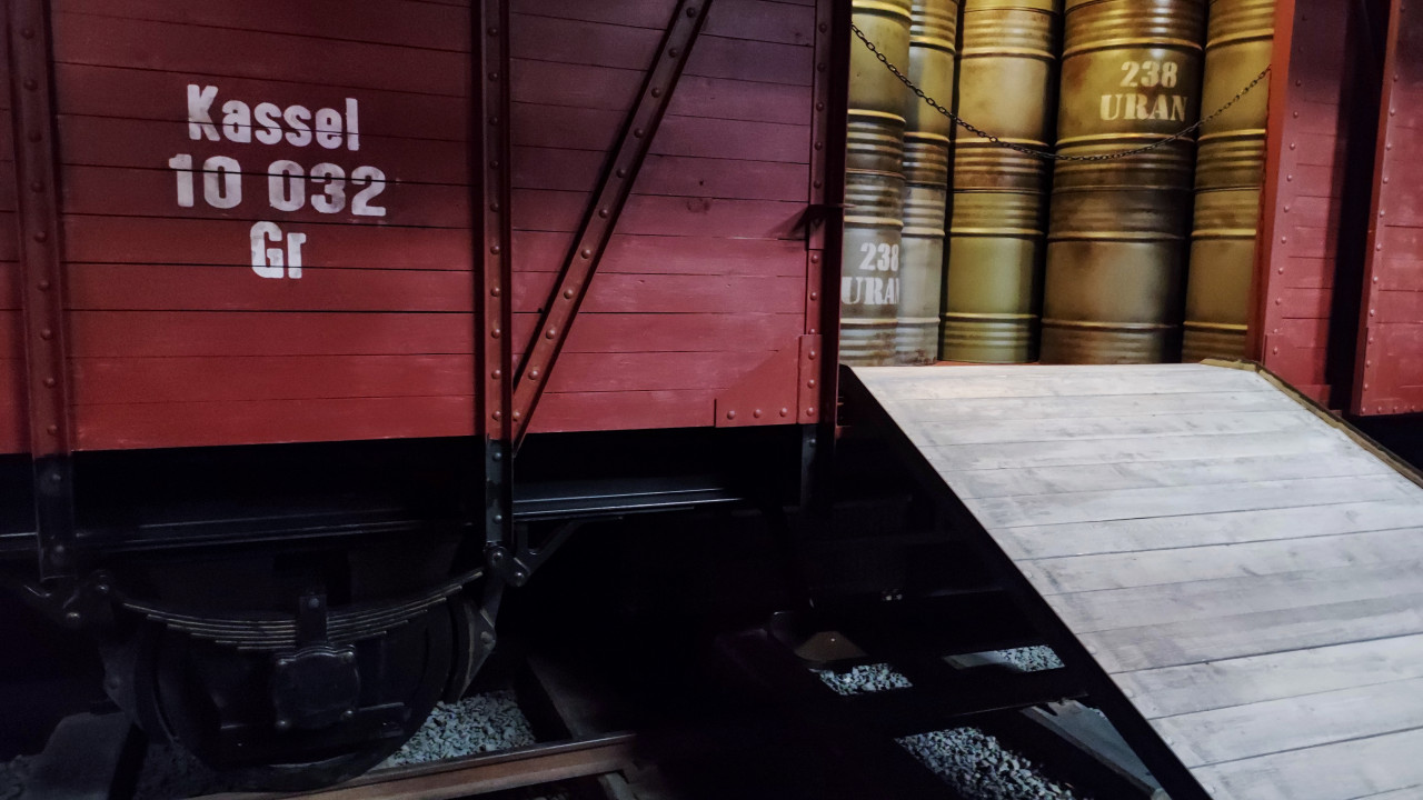 На снимке запечатлён фрагмент стилизованного грузового вагона с маркировкой «Kassel 10 032 Gr», входящего в историческую инсталляцию павильона «АТОМ» на ВДНХ, представленного в рамках выставки-форума «Россия» 2023–2024 годов. Внутри вагона видны ряды металлических бочек оливкового цвета с надписью «238 URAN», отсылающих к тематике перевозки сырья в период становления атомной промышленности. Справа расположена наклонная деревянная аппарель, ведущая к открытому дверному проёму. Фото подходит для материалов о музейных экспозициях, реконструкциях и истории атомной энергетики.