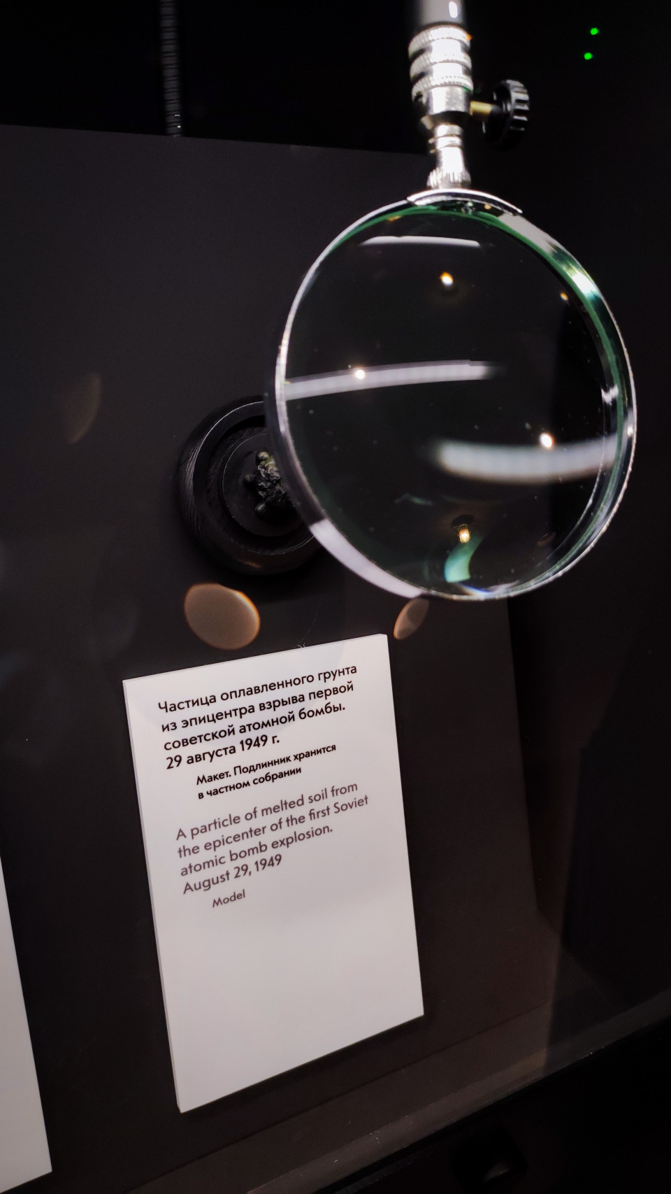 На фото запечатлён музейный экспонат в павильоне «АТОМ» на ВДНХ, снятый во время международной выставки-форума «Россия» 2023–2024 годов. В центре кадра находится увеличительное стекло, зафиксированное на металлическом держателе, через которое демонстрируется модель частицы оплавленного грунта из эпицентра взрыва первой советской атомной бомбы РДС-1, проведённого 29 августа 1949 года. Под экспонатом размещена двуязычная информационная табличка. Кадр подходит для образовательных материалов об истории атомного проекта СССР, музейных экспозициях и научных демонстрациях.