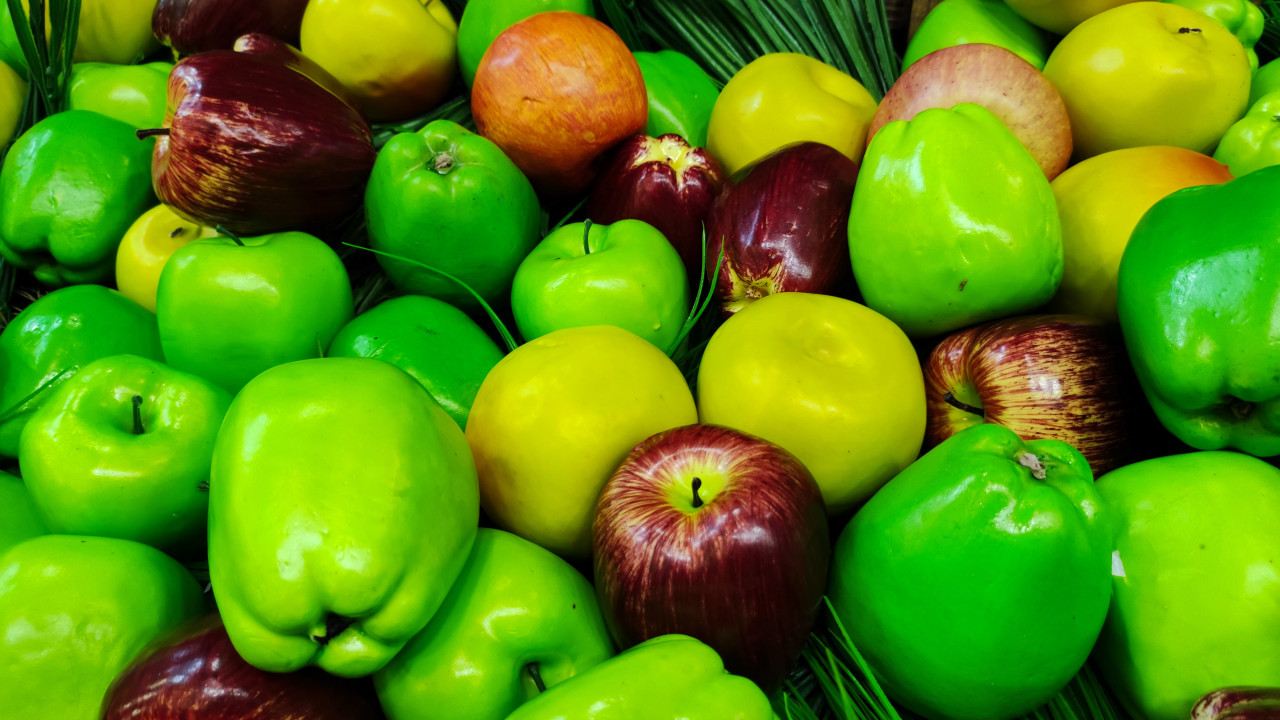 На изображении показана крупная выкладка разноцветных яблок, снятая в павильоне выставки на ВДНХ. В кадре видны зелёные, жёлтые и красные плоды, уложенные плотным слоем и дополненные декоративной зеленью. Судя по аккуратной укладке и однородному блеску поверхности, плоды являются декоративными муляжами, использованными для оформления тематической зоны. Фотография может применяться в материалах о торговых витринах, оформлении выставок, визуальном мерчендайзинге и продуктах питания.