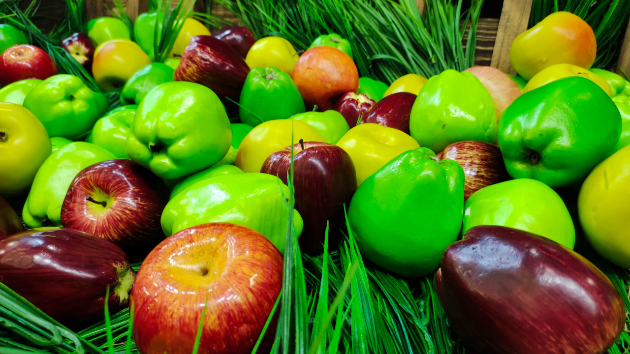 На фотографии показана композиция из зелёных, жёлтых и красных яблок, расположенных на фоне декоративной зелени. Снимок выполнен на выставочной площадке, что видно по аккуратной организации пространства и искусственному блеску плодов, характерному для муляжей. Фрукты уложены плотным слоем, создавая эффект насыщенной палитры. Такой кадр подходит для использования в дизайне рекламных материалов, статей о визуальном оформлении стендов и тем, связанных с сельским хозяйством и продовольствием.