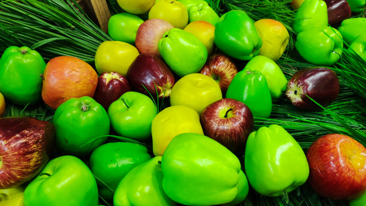 Смешанная выкладка зелёных и красных яблок среди декоративной травы
