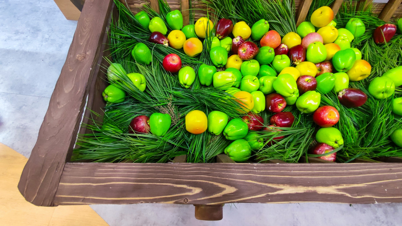 Деревянная телега с декоративными фруктами в выставочном павильоне
