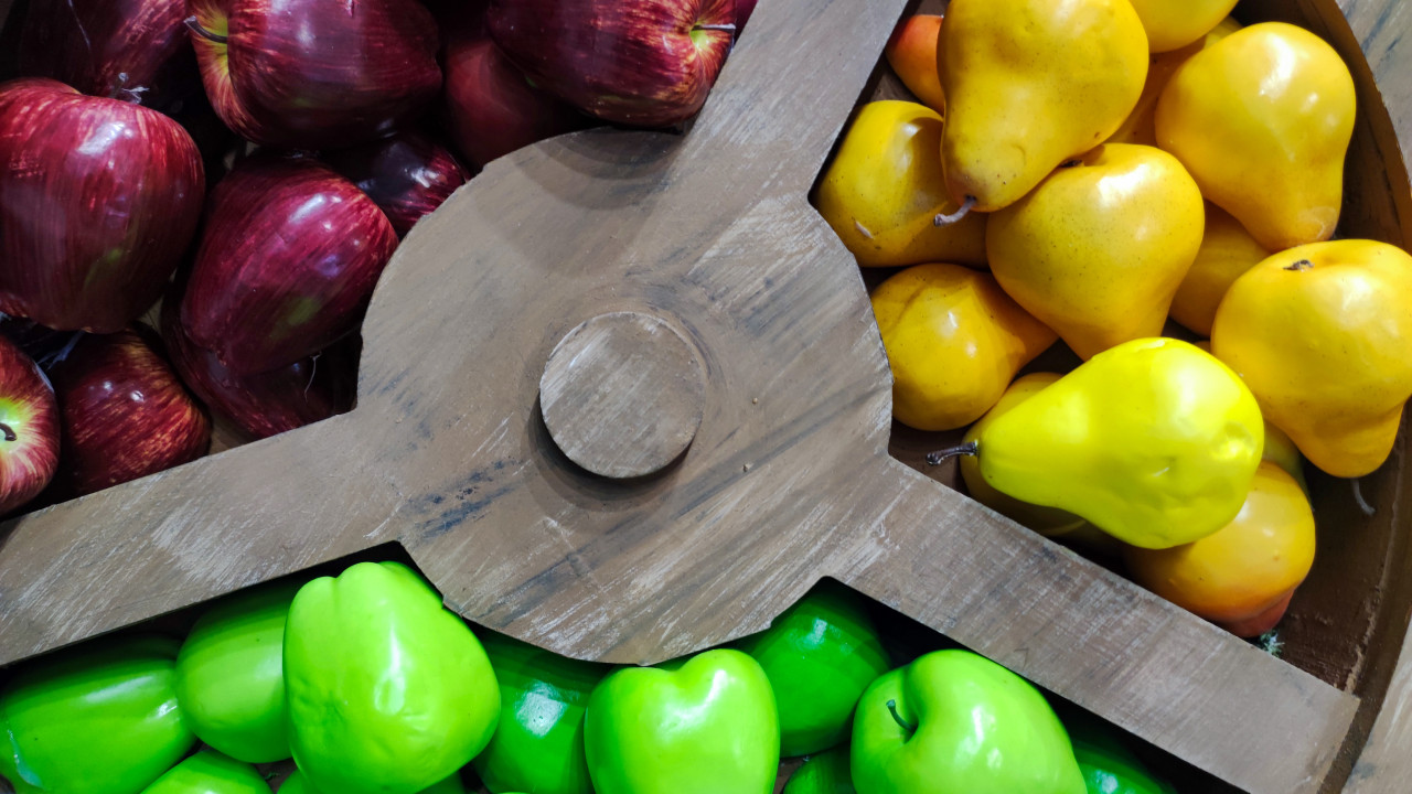 Декоративное колесо с сегментами фруктовых муляжей