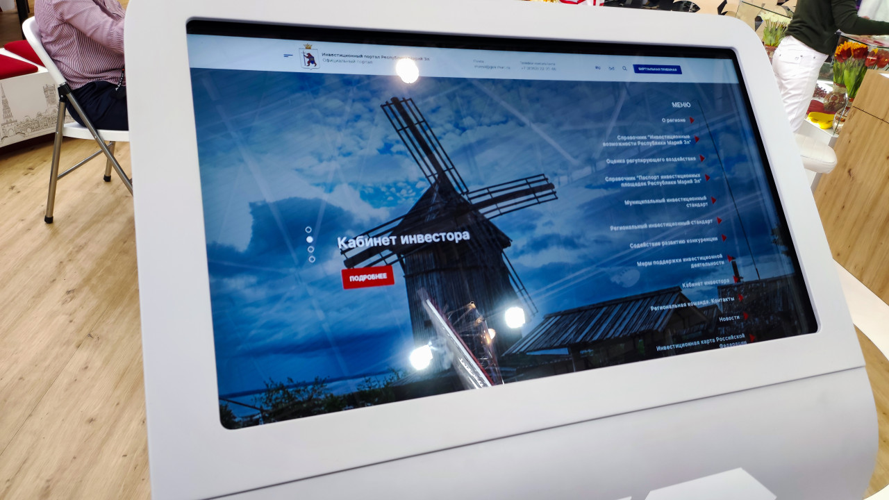 Фото показывает интерактивный терминал с открытой страницей инвестиционного портала Республики Марий Эл в павильоне №75 ВДНХ на выставке-форуме «Россия». На экране — изображение деревянной мельницы, характерной для архитектуры региона. На заднем плане видны детали выставочного пространства и посетители. Снимок подходит для тем о цифровых сервисах, региональном развитии и презентации инфраструктурных проектов.