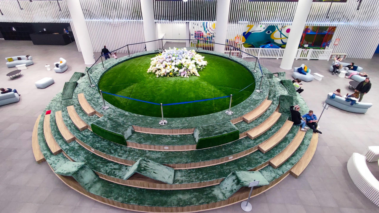 На фото представлена круглая многоуровневая зелёная площадка с центральной цветочной композицией, расположенная в большом атриуме павильона «АТОМ» на ВДНХ. Видны ступенчатые зоны для сидения, элементы мебели, посетители, а также панорамные конструкции современного павильона, открытого в 2023 году в рамках выставки-форума «Россия». Архитектурный объект служит зоной отдыха и точкой притяжения внутри здания. Снимок подходит для материалов об общественных пространствах, архитектуре и выставочном дизайне.