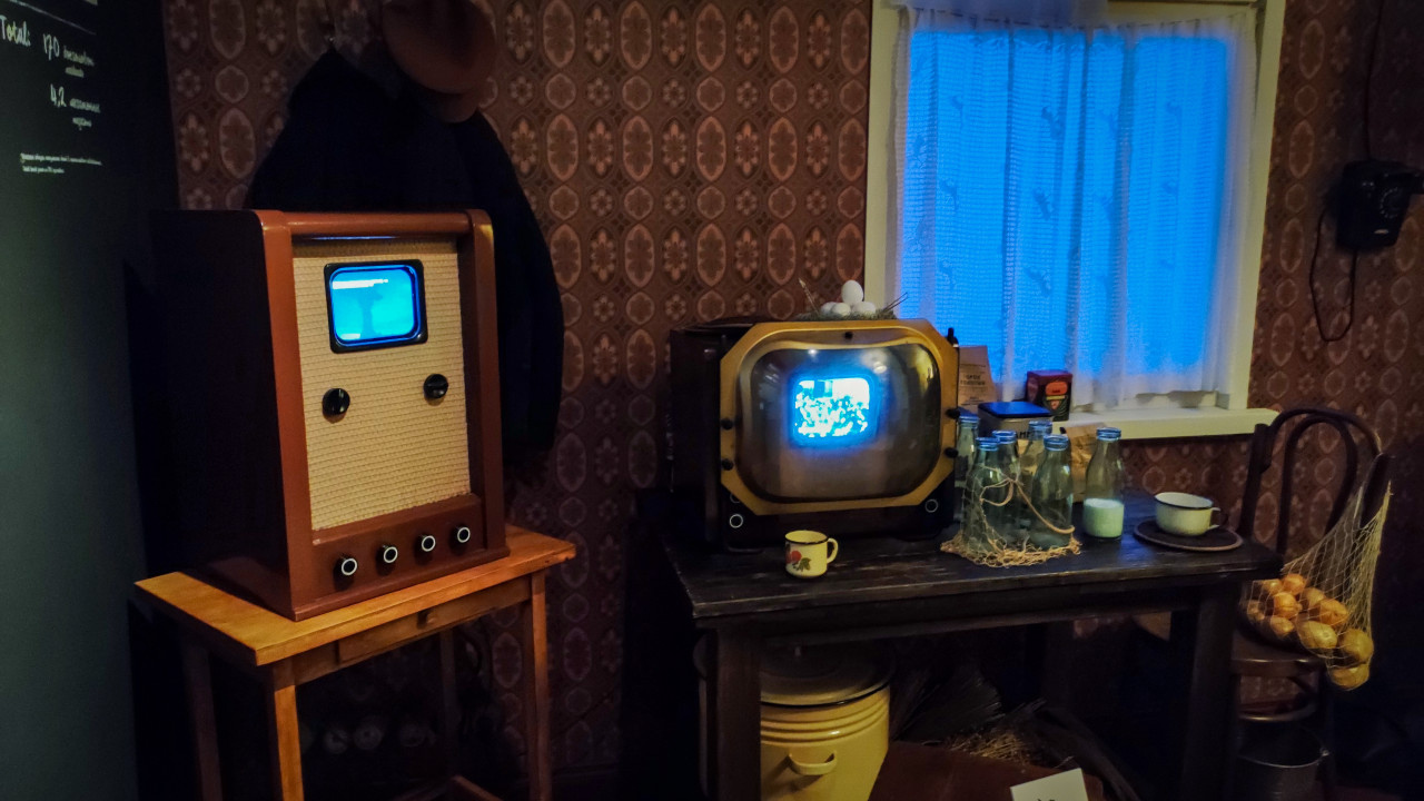 Два ретро-телевизора в стилизованной комнате советской эпохи