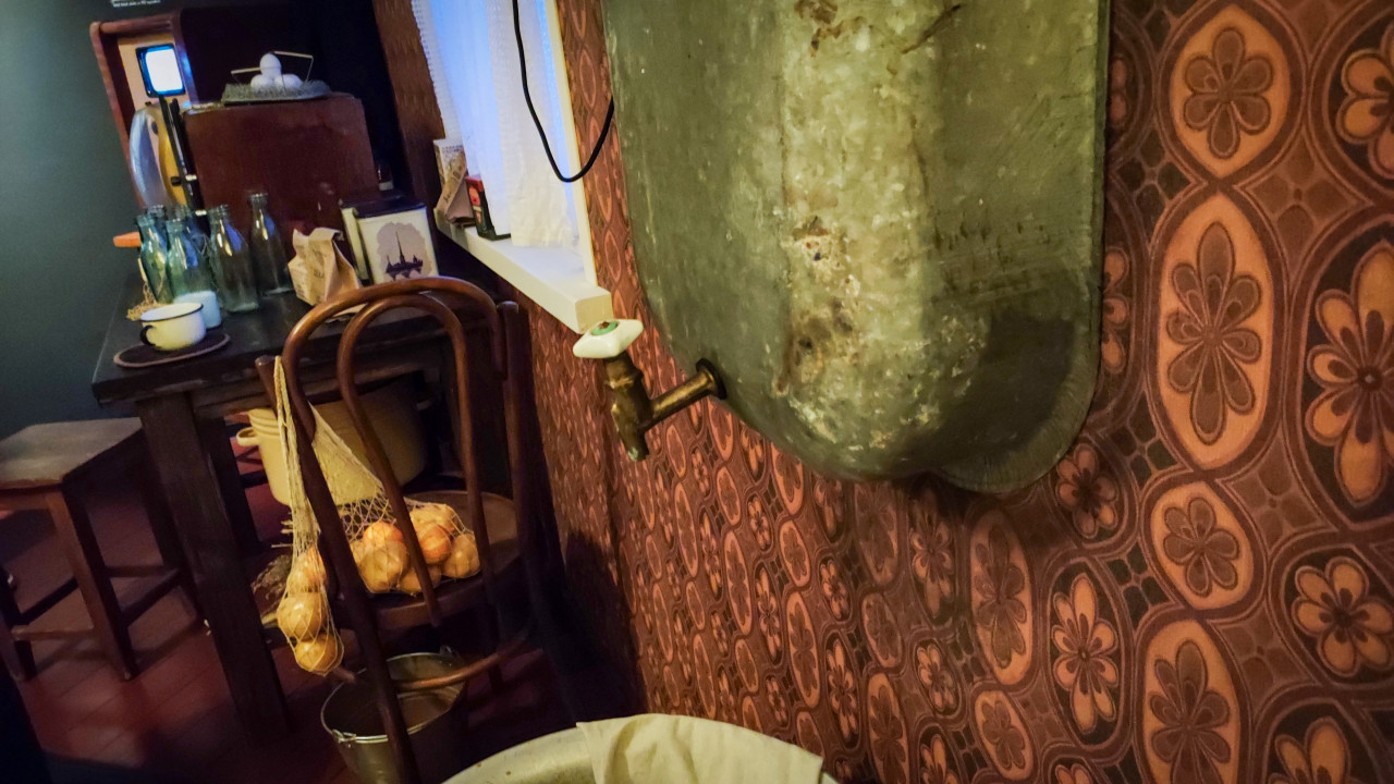 На снимке показана часть исторической зоны павильона «АТОМ» на ВДНХ, представленной во время выставки-форума «Россия» 2023–2024 годов. В кадре виден настенный металлический умывальник с латунным краном и фарфоровой ручкой, под ним — таз. На фоне располагается стол с бутылками, кружкой, контейнерами и продуктами, а также деревянный стул с сеткой, в которой лежат луковицы. Стена оформлена характерными узорными обоями середины XX века. Фотография может использоваться в публикациях о музейных реконструкциях, истории советского быта и интерьерных инсталляциях.