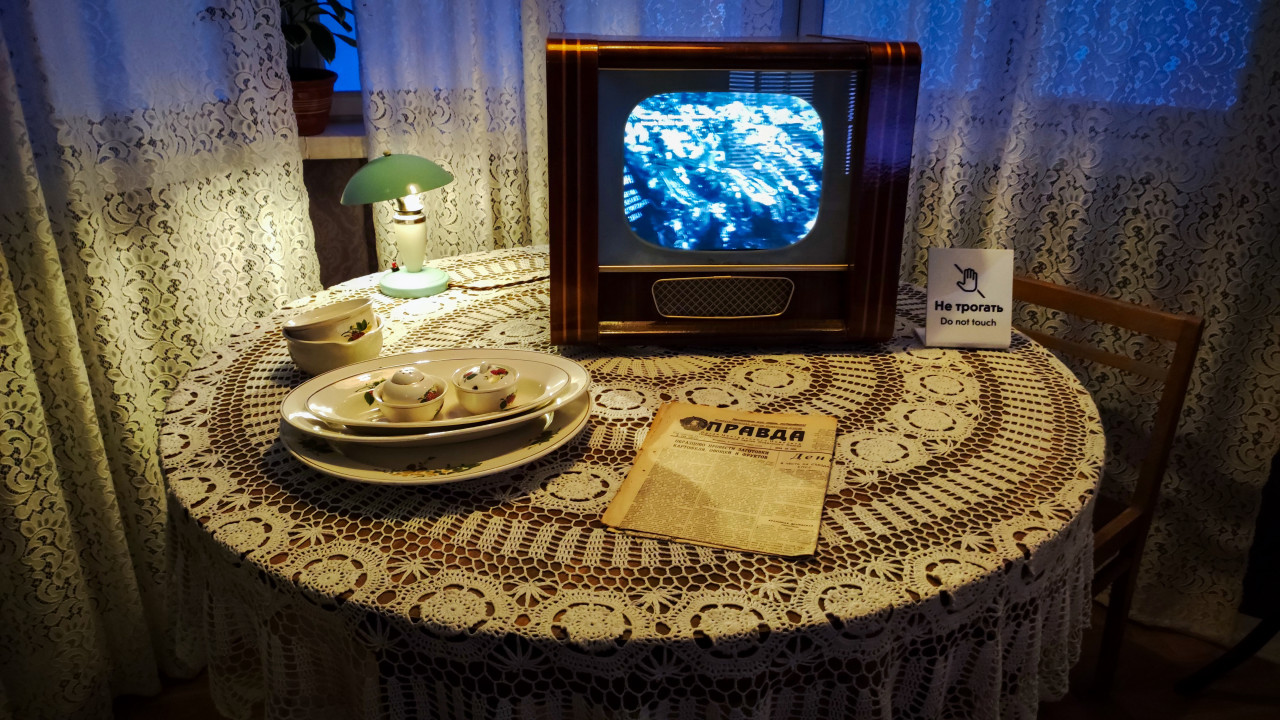На фотографии запечатлена музейная инсталляция, воспроизводящая атмосферу городской квартиры конца 1950-х годов. В центре стола, покрытого вязаной кружевной скатертью, стоит телевизор «Рекорд», одна из массовых советских моделей, выпускавшихся с 1956 года. Устройство размещено на фоне кружевных занавесок, рядом расположены настольная лампа с зелёным плафоном, фарфоровая посуда с ягодным рисунком и выпуск газеты «Правда». На табличке указано «Не трогать», что подчёркивает музейный характер экспозиции. Снимок подходит для материалов о советском быте, исторических выставках и тематических публикациях.