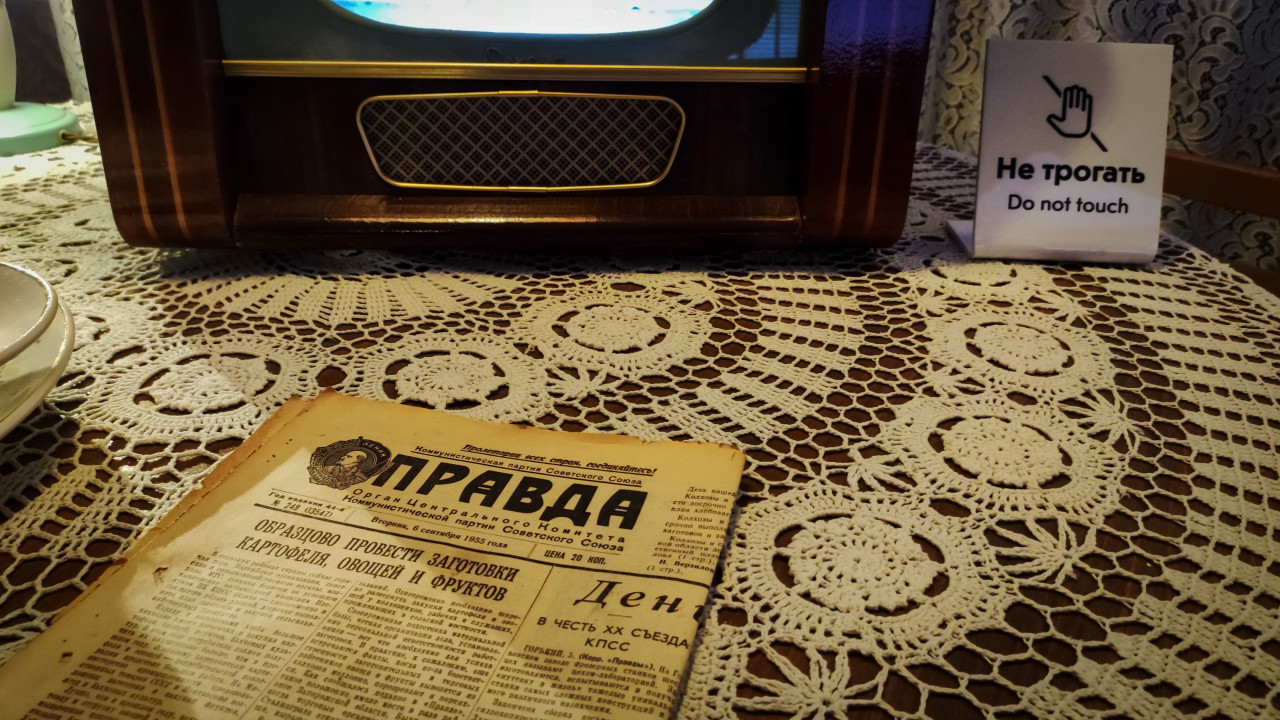 На снимке крупным планом представлена газета «Правда» от сентября 1955 года, лежащая на столе с вязаной кружевной скатертью. Справа частично видна табличка «Не трогать», а в верхней части кадра — нижняя панель телевизора «Рекорд», созданного в СССР и выпускавшегося с 1956 года на нескольких радиозаводах. Изображение демонстрирует предметы, характерные для интерьеров середины XX века, и передаёт атмосферу музейной реконструкции. Такой кадр подходит для тематических статей об истории печати, бытовой культуре и визуального оформления экспозиций.