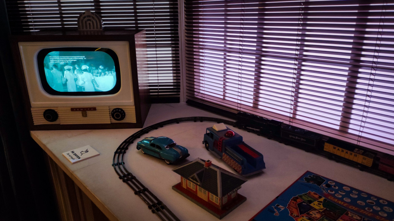 вднх павильон атом выставка россия ретроинтерьер музейная экспозиция историческая реконструкция предметы быта интерьерная инсталляция ретродизайн культура прошлого тематическая зона экспозиционное пространство интерьер прошлого века интерьер телевизор Zenith ретро винтаж игрушки железная дорога рельсы детский транспорт выставка музей пожарная машина автомобиль игрушечный вокзал жалюзи освещение экспозиция техника прошлого история быта интерьер XX века ретро комната старинная электроника коллекционные модели детская зона игрушечный транспорт антиквариатПохожие фотографии