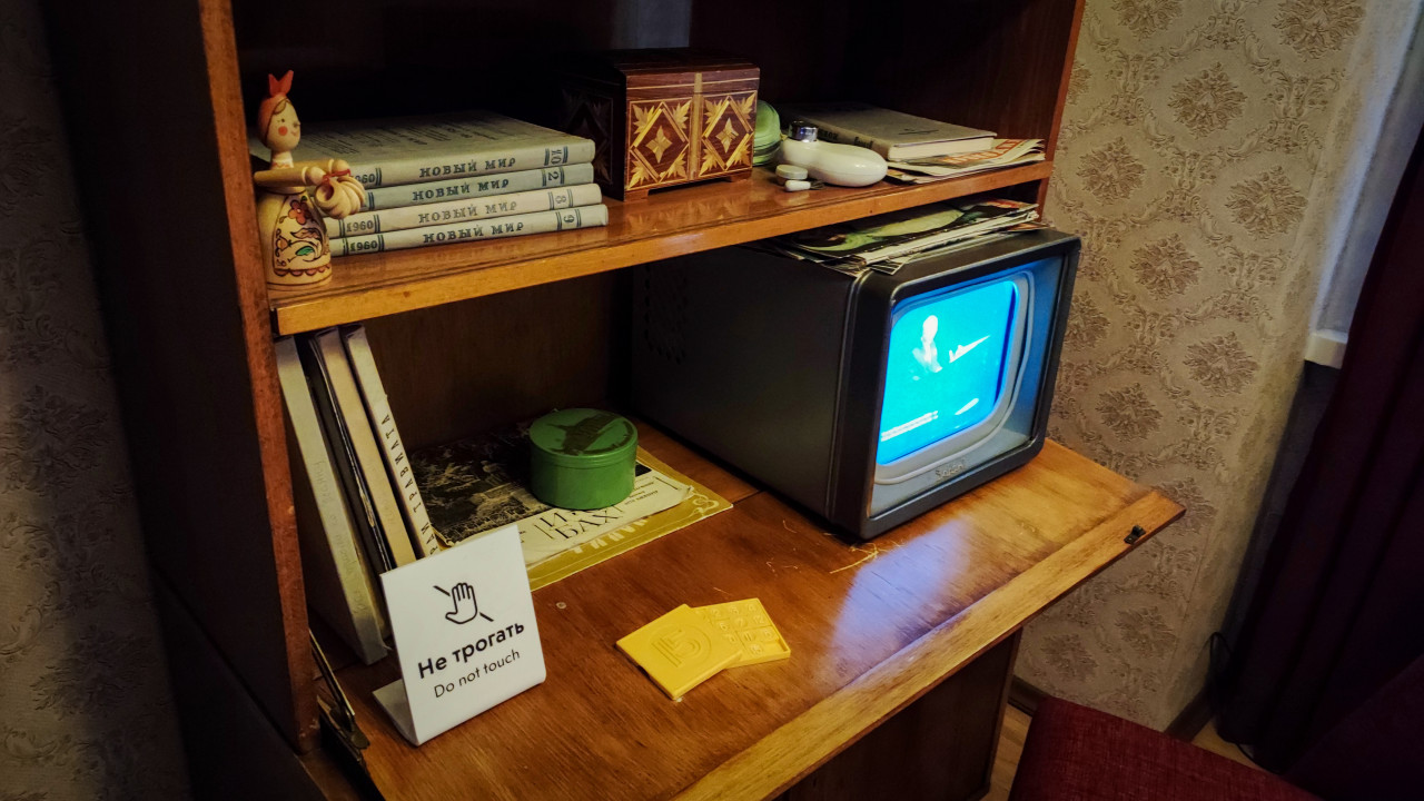 На фото запечатлён уголок советского интерьера, в котором деревянный шкаф используется для размещения журналов «Новый мир», нотных изданий, деревянной фигурки и инкрустированной шкатулки. На нижней полке стоит включённый ламповый телевизор, транслирующий черно-белый сюжет. На поверхности мебели расположены пластиковые карточки и табличка «Не трогать». Интерьер выполнен в стилистике 1960-х годов и подходит для публикаций об истории быта, музейных реконструкциях и теме культурных привычек советских семей.