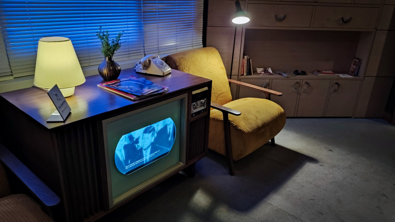 Кадр фиксирует часть реконструированного интерьера 1960-х годов в подземном уровне павильона «АТОМ» на ВДНХ, созданного для зоны «Советский атомный проект». На снимке видны кресло с жёлтой обивкой, тумба с лампой, телефона аппаратом с дисковым набором и стопкой журналов, а также винтажный телевизор с документальным видеорядом. В глубине расположена встроенная мебель и настольная лампа. Этот снимок подходит для публикаций о советской культуре, музейных экспозициях и истории атомной отрасли.