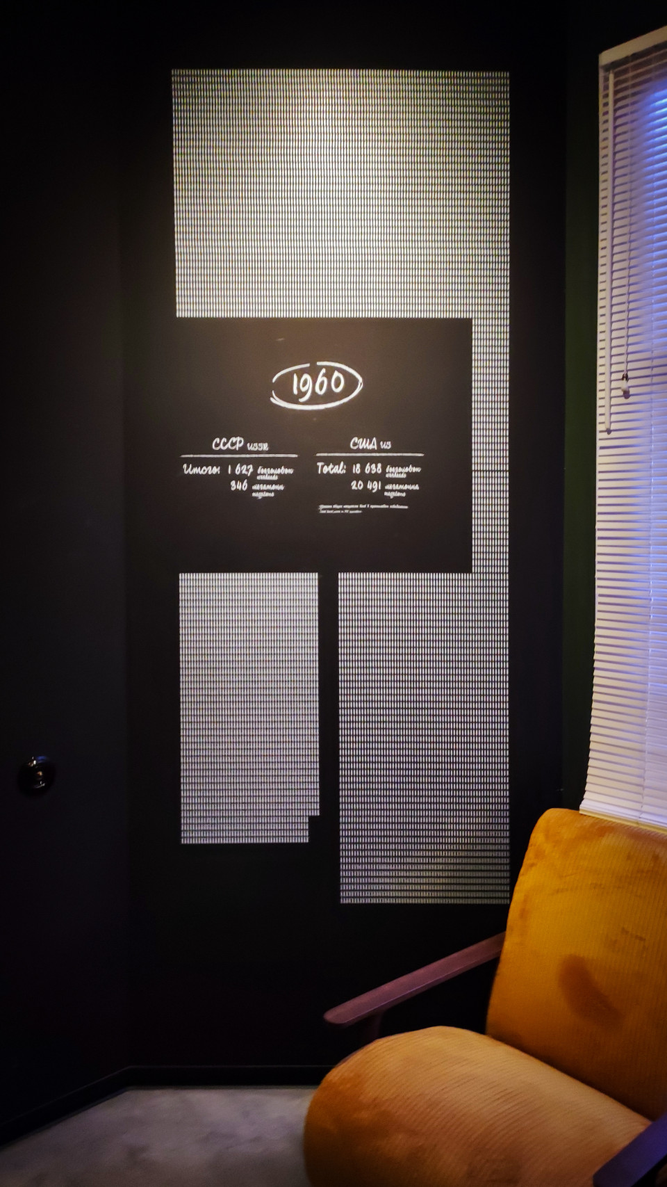 Снимок показывает стеновую панель в зоне «Советский атомный проект» павильона «АТОМ» на ВДНХ, содержащую данные о состоянии ядерных программ СССР и США в 1960 году. Панель выполнена в стиле инфографики, окружена декоративными элементами и расположена рядом с частью интерьера, оформленного под бытовые условия эпохи. На переднем плане видно кресло в жёлтой обивке. Фото подходит для материалов об истории атомной отрасли, музейных инсталляциях и образовательных экспозициях.
