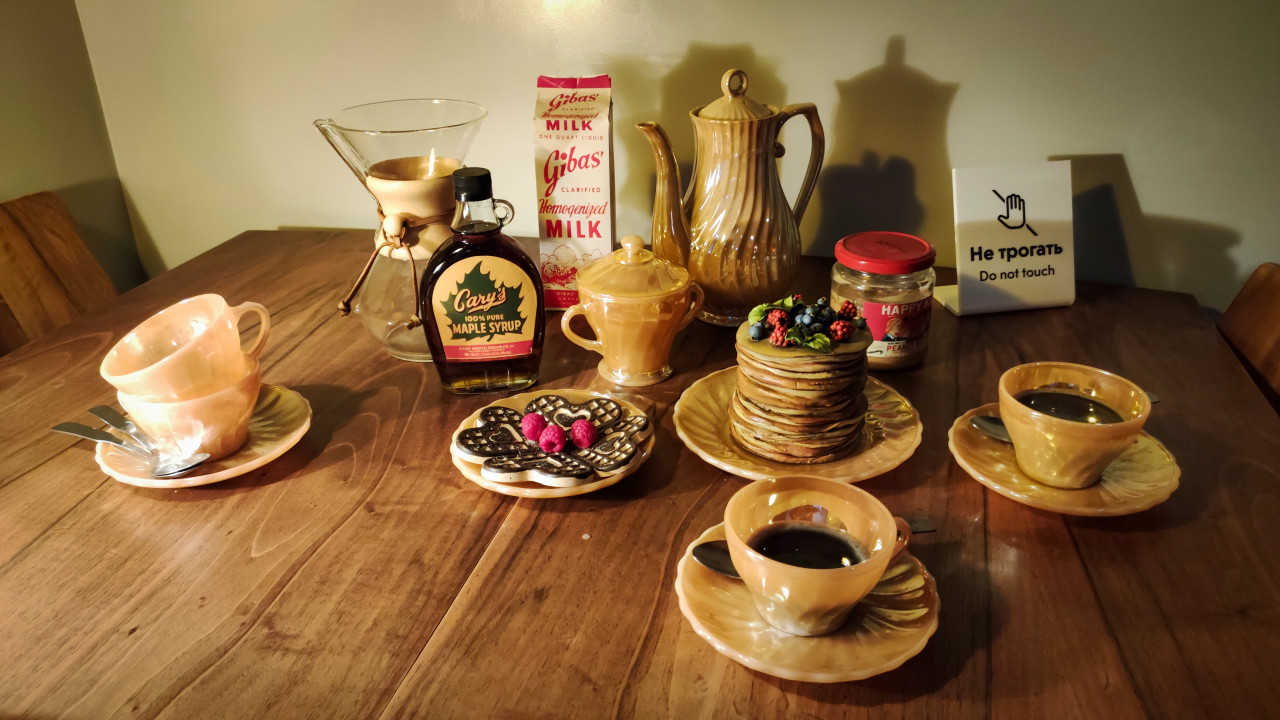 На фото запечатлена детализированная сервировка стола в реконструированной кухне 1960-х годов, входящей в историческую экспозицию павильона «АТОМ» на ВДНХ. На деревянной поверхности расположены чашки, вафли, стопка блинчиков с ягодами, сосуды для напитков, упаковка молока, бутылка кленового сиропа и банка арахисового масла. Атмосфера подчёркивает бытовую сцену эпохи, созданную в рамках зоны «Советский атомный проект». Снимок подходит для материалов о культуре питания, музейных реконструкциях и истории быта.