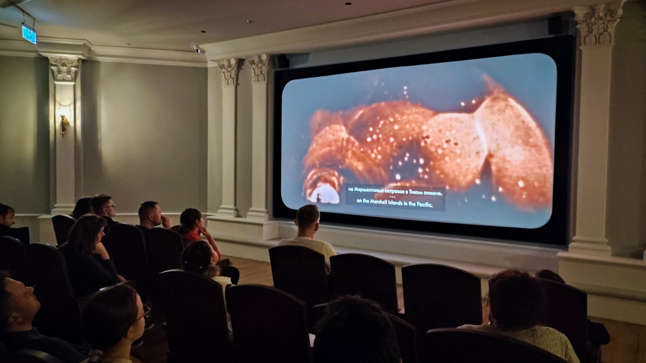Снимок демонстрирует часть кинозала внутри павильона «АТОМ» на ВДНХ, открытого в 2023 году в рамках выставки-форума «Россия». В кадре видны ряды кресел, зрители и крупный экран, на котором транслируется документальный материал с субтитрами о ядерных испытаниях. Интерьер оформлен колоннами и декоративными элементами, создающими атмосферу лекционного или музейного пространства. Фото подходит для материалов о выставочных мероприятиях, образовательных залах и культурных событиях.