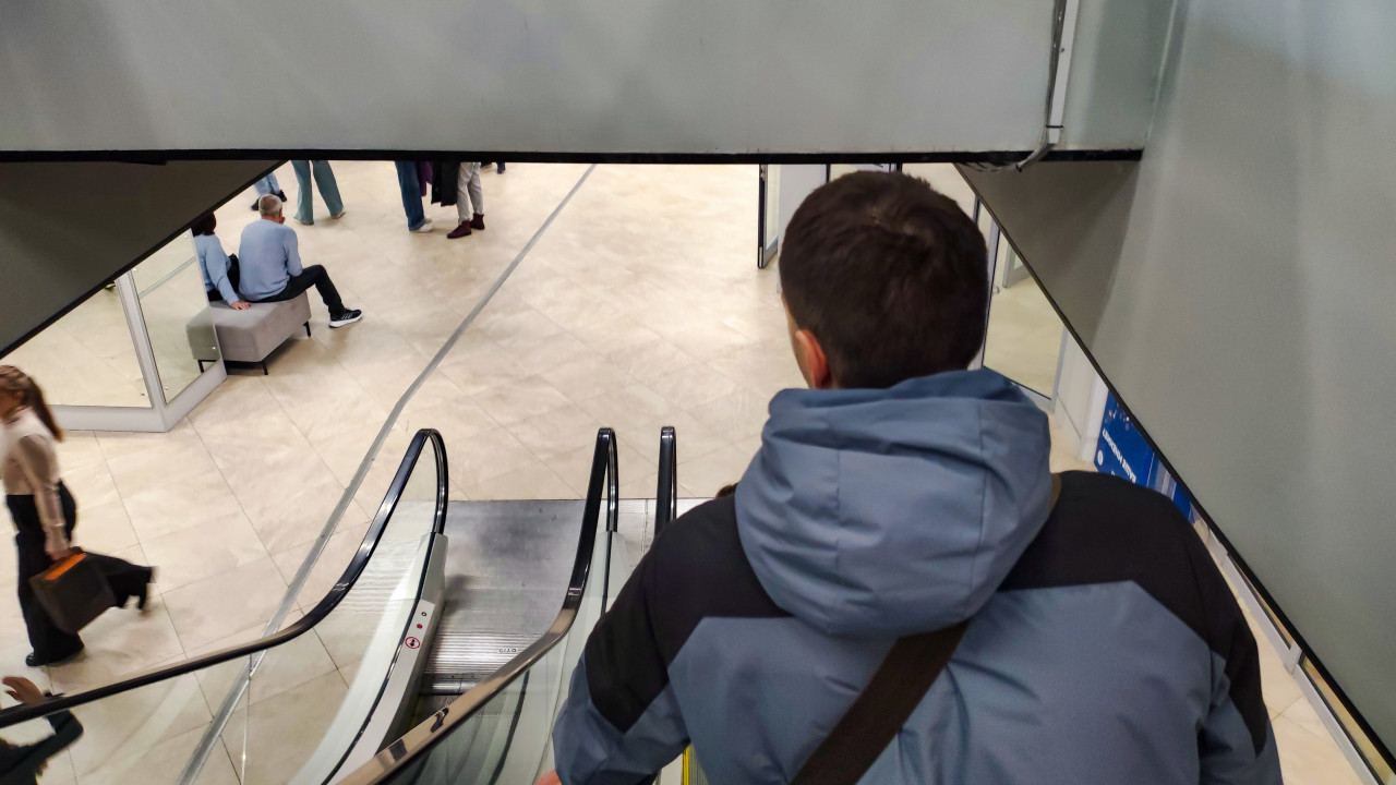 На фото изображён мужчина в верхней одежде, спускающийся по эскалатору в просторном вестибюле с бежевой плиткой. Внизу видны сидящие посетители, зеркальная панель и проходящая мимо женщина. Снимок сделан в общественном пространстве выставочного комплекса, что видно по оформлению интерьера и потоку людей. Кадр отражает повседневное движение посетителей, характерное для крупных мероприятий, и может применяться в материалах о транспорте внутри зданий, навигации, инфраструктуре и городской среде.