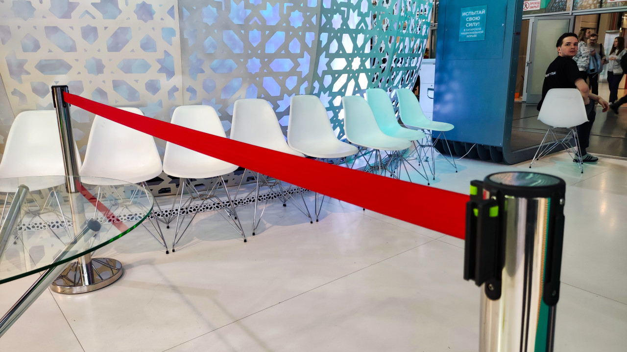 На фото запечатлена зона ожидания в павильоне №75 на выставке-форуме «Россия», ограниченная красной лентой между хромированными стойками. На заднем плане располагаются белые пластиковые стулья и дизайнерская стеновая панель с геометрическим рисунком. Кадр отражает организацию пространств на выставке и может применяться для материалов о мероприятиях, инфраструктуре и публичных пространствах.