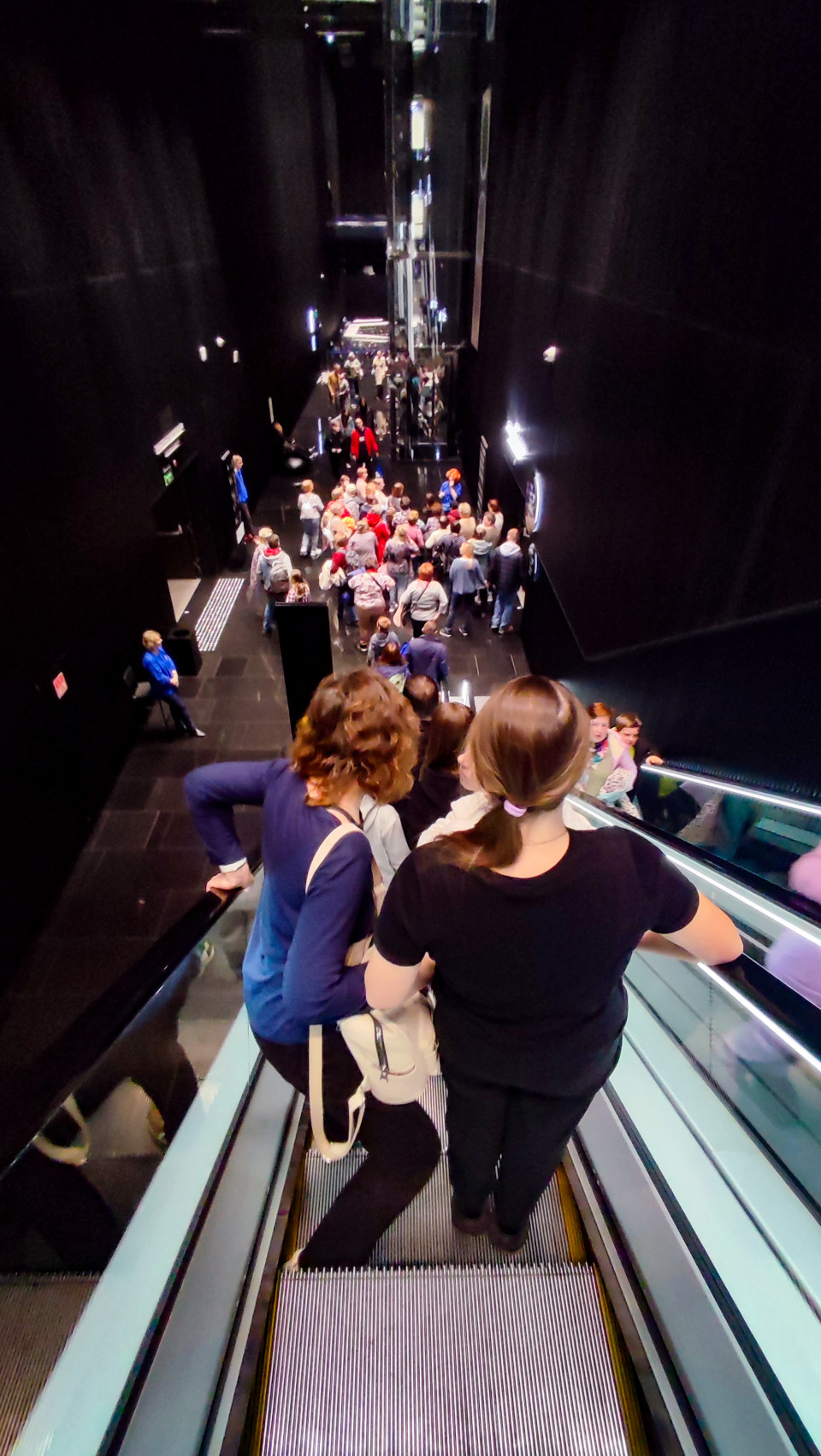 Спуск посетителей по эскалатору к подземным экспозициям павильона «Атом»