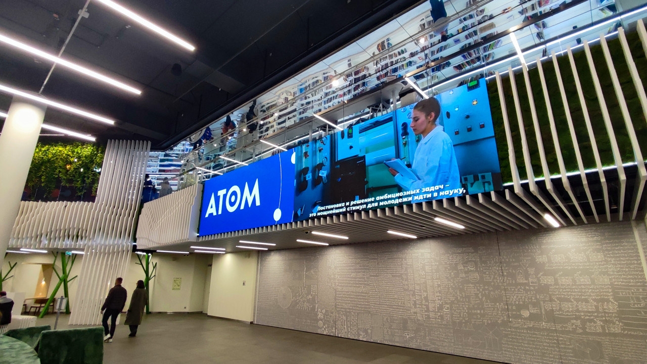 Экран и стеклянные галереи внутри павильона «АТОМ» на ВДНХ