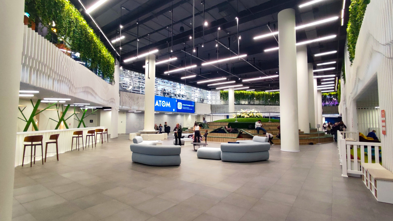вднх выставка россия павильон интерьер общественное пространство современный дизайн экспозиция инфраструктура мероприятие ВДНХ павильон АТОМ зона отдыха барная стойка высокие стулья растения зелёные панели стеклянный балкон выставка Россия Москва архитектура современный дизайн музей посетители общественное пространство технопарк наука атомная отрасль инновации диваны столики освещение интерьерная зона культурное событиеПохожие фотографии