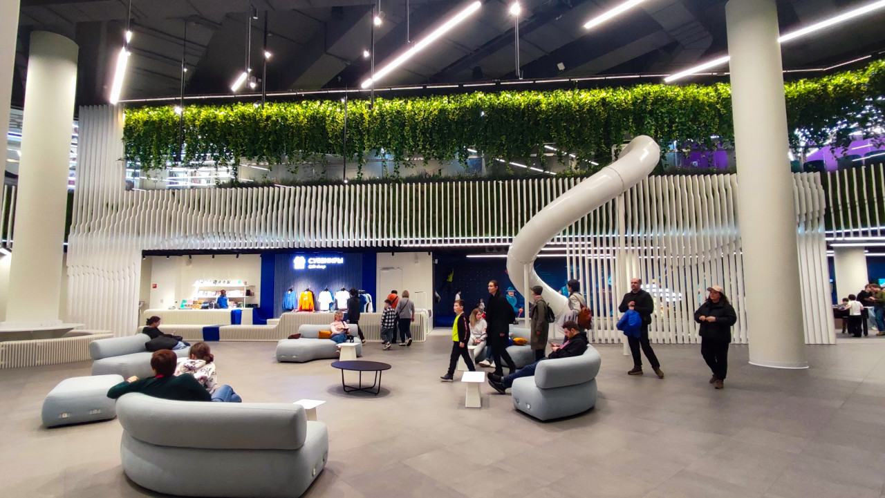 вднх выставка россия павильон интерьер общественное пространство современный дизайн экспозиция инфраструктура мероприятие ВДНХ павильон АТОМ горка игровая зона торговая зона магазин выставка Россия Москва атомная промышленность современные музеи зелёные панели растения посетители стеклянный балкон архитектура инновации семейное пространство интерактив общественное место технопарк дизайн развлечения образовательная среда научная тематикаПохожие фотографии
