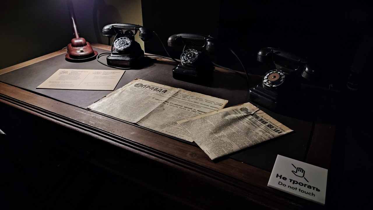 На фотографии представлен расширенный вид экспозиционной зоны павильона «АТОМ» на ВДНХ, где демонстрируются материалы советского периода развития атомной отрасли. На столе размещены газеты «Правда» и «Красная звезда», служебные документы и несколько дисковых телефонов середины XX века. Слева видна настольная лампа, создающая локальную подсветку. Эта зона относится к разделу «Советский атомный проект» на подземных уровнях павильона. Снимок можно использовать в материале о музейных экспозициях, истории связи и технологическом наследии СССР.