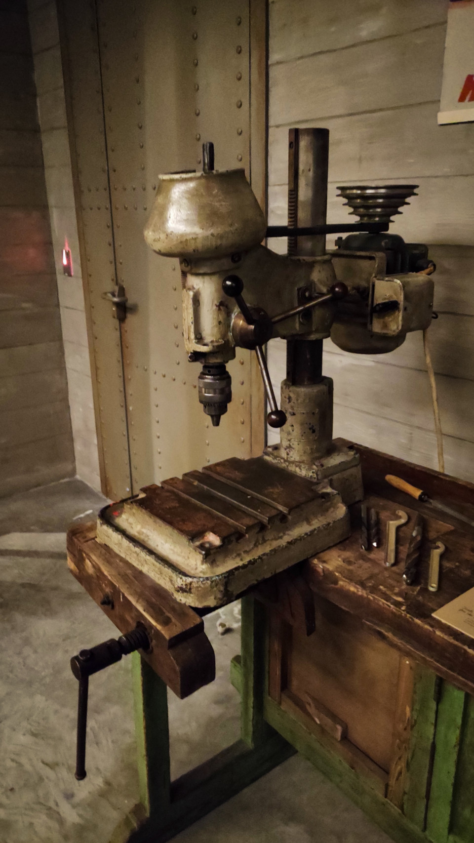 На фото изображён настольный сверлильный станок середины XX века, установленный на деревянном верстаке в исторической зоне павильона «Атом» на ВДНХ. Станок имеет литую металлическую стойку, вручную управляемый механизм подачи и характерные следы эксплуатации. На заднем плане видна металлическая дверь и деревянная стеновая отделка, стилизованная под цеховое помещение. Экспозиция воссоздаёт рабочие условия специалистов, участвовавших в становлении советской атомной промышленности. Снимок подходит для материалов об инженерии, истории производства и музейных реконструкциях.