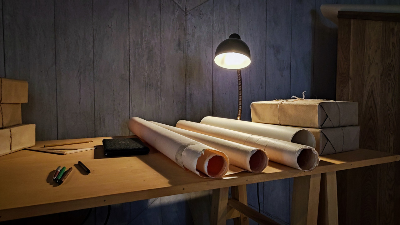 Фотография демонстрирует фрагмент инженерной зоны внутри павильона «АТОМ» на ВДНХ, где размещён стол с рулонами чертежей, канцелярией, упакованными коробками и настольной лампой. Оформление напоминает рабочее пространство специалистов советского атомного проекта, представленного на подземных уровнях павильона в рамках исторической экспозиции выставки-форума «Россия» 2023–2024 годов. Тематическое освещение и аккуратно разложенные элементы создают впечатление реконструкции инженерного процесса. Снимок пригоден для публикаций о технической истории, музейных экспозициях и образовательных программах.