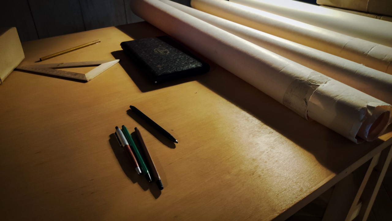 На изображении виден фрагмент рабочего стола с чертёжными принадлежностями, расположенного в исторической зоне павильона «Атом» на ВДНХ, где воссоздано рабочее пространство инженеров атомной отрасли середины XX века. На столе лежат карандаши, треугольник, блокнот и часть рулонов бумаги, освещённых мягким локальным светом. Экспозиция стала частью выставки-форума «Россия» 2023–2024 годов и демонстрирует элементы повседневной инженерной работы того периода. Снимок подходит для тематических публикаций о техническом образовании, музейных экспозициях и истории промышленности.