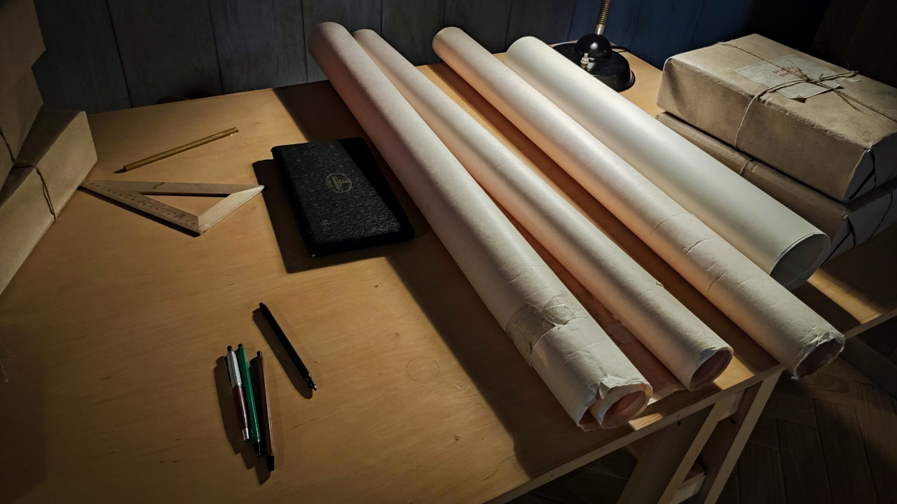 Стол с чертежами и инструментами в исторической зоне павильона «Атом»