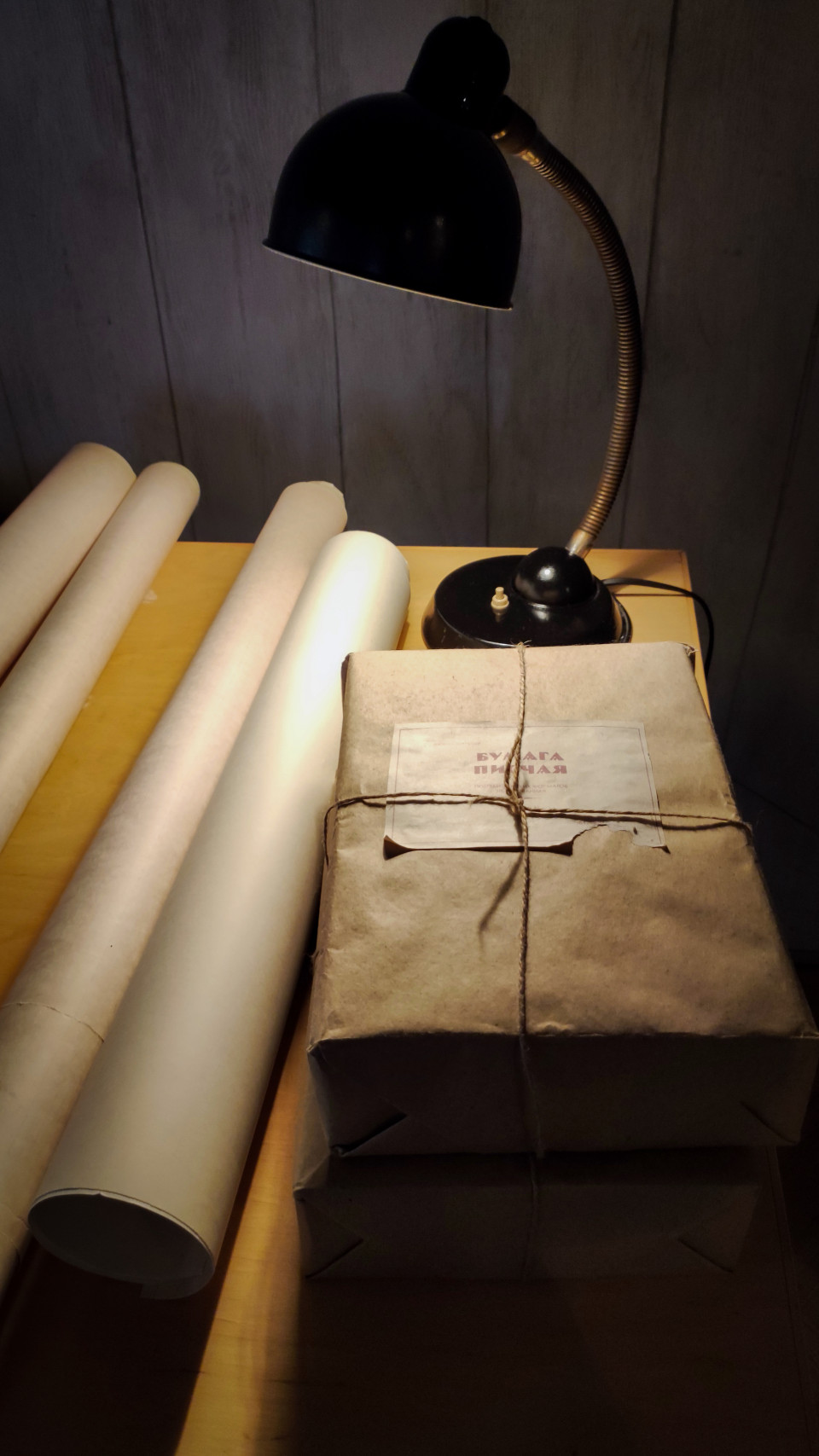 На изображении запечатлён фрагмент рабочего стола с настольной лампой, тремя рулонами бумаги и несколькими упакованными бумажными пакетами, расположенный в исторической зоне павильона «Атом» на ВДНХ. Этот элемент экспозиции демонстрирует рабочие условия инженерных коллективов советского атомного проекта середины XX века и является частью выставки-форума «Россия» 2023–2024 годов. Детали упаковки, фактура бумаги и характерное лабораторное освещение подчёркивают атмосферу восстановленного рабочего процесса эпохи. Снимок подходит для публикаций о музейных экспозициях и истории инженерной деятельности.