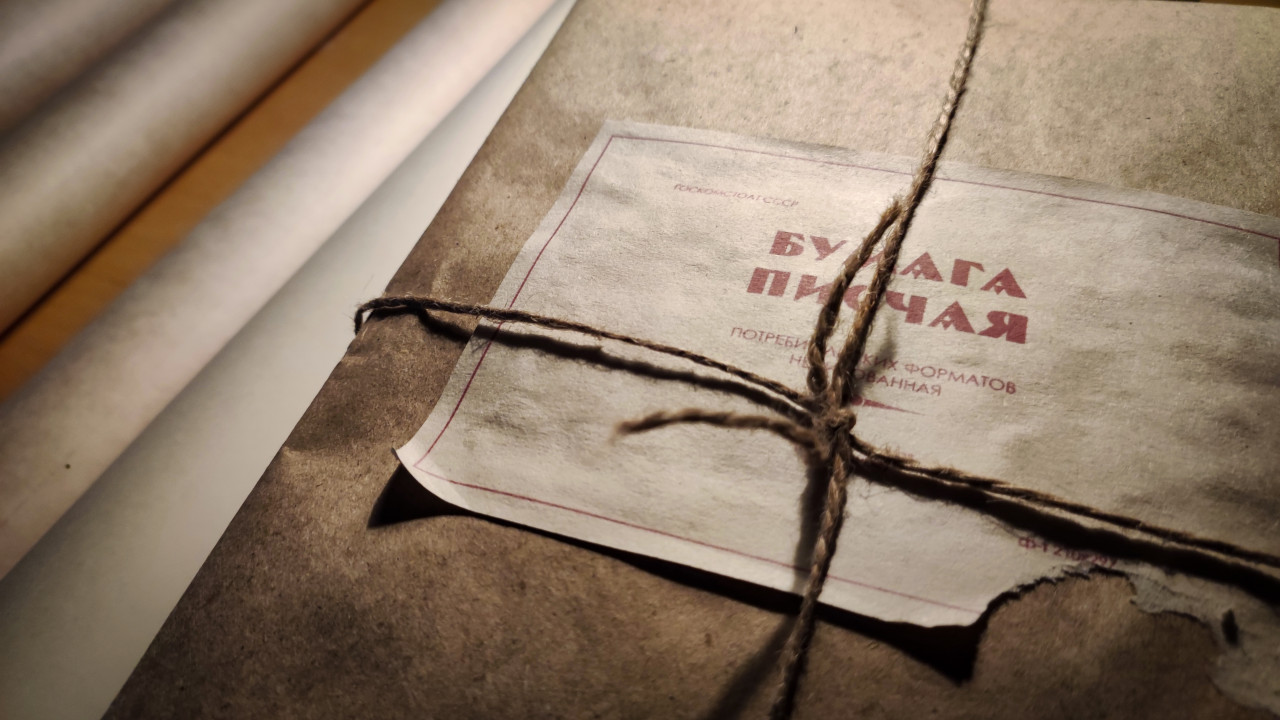 На фото крупным планом показан пакет чертёжной бумаги, перевязанный бечёвкой, с сохранившейся маркировкой, лежащий на столе в экспозиции павильона «Атом» на ВДНХ. Детали этикетки с надписью «Бумага писчая» передают эстетику материалов, использовавшихся в середине XX века в инженерной документации. Экспозиция представлена в рамках выставки-форума «Россия» 2023–2024 годов и отражает рабочие процессы советских специалистов атомной отрасли. Изображение можно использовать в публикациях о музейных экспозициях, истории технологий и архивных материалах.