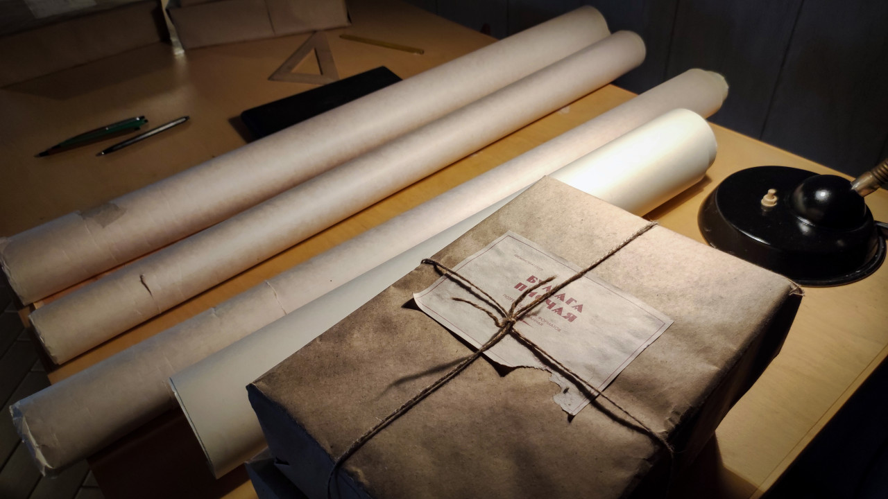На изображении показан пакет чертёжной бумаги, перевязанный бечёвкой, размещённый на столе рядом с рулонами бумаги, настольной лампой и чертёжными принадлежностями в исторической зоне павильона «Атом» на ВДНХ. Этот фрагмент экспозиции, представленный в рамках выставки-форума «Россия» 2023–2024 годов, передаёт атмосферу рабочих кабинетов специалистов советского атомного проекта, использовавших подобные материалы в процессе конструкторской работы. Освещение подчёркивает фактуру бумаги, создавая документальный характер сцены. Фото подходит для публикаций о музейных реконструкциях, инженерных процессах и архивных материалах.