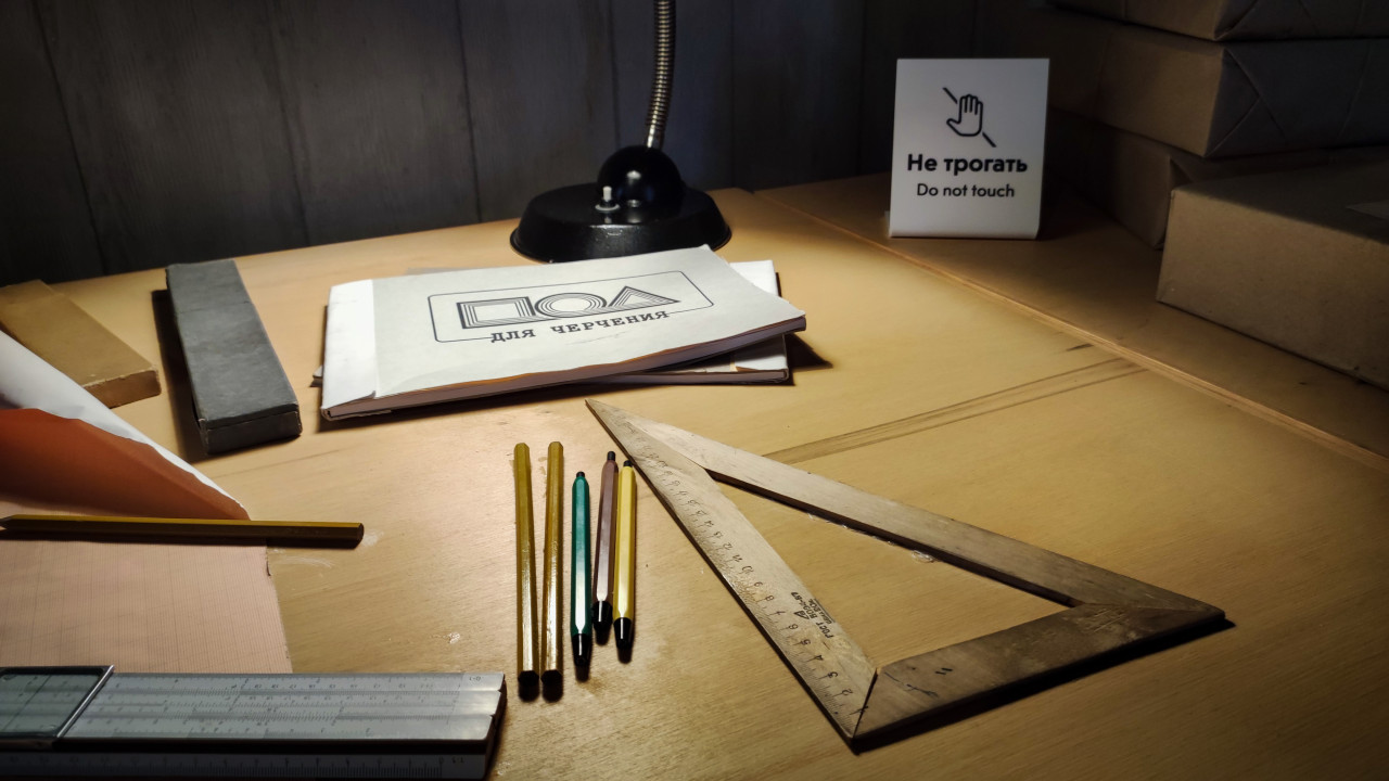 Чертёжные инструменты и тетради на рабочем столе в павильоне «Атом»