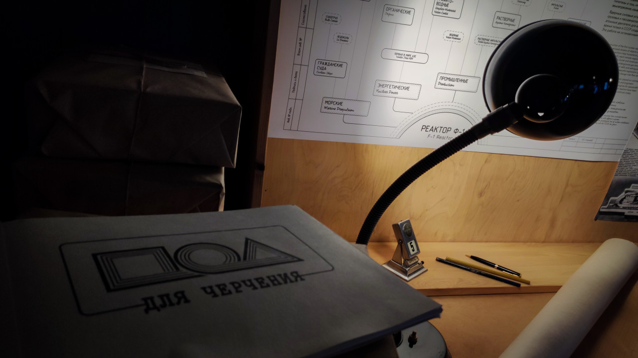 Рабочее место инженера под настольной лампой в павильоне «АТОМ»