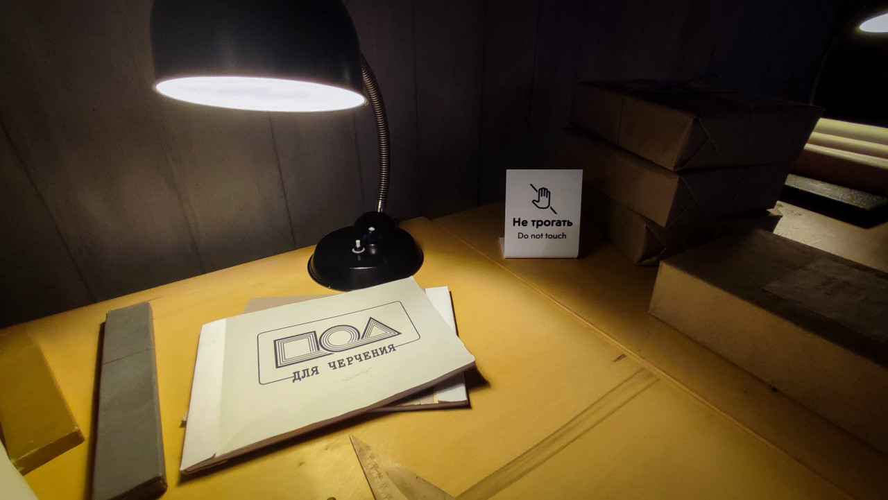 На фото запечатлена часть экспозиции в павильоне «АТОМ» на ВДНХ, оформленной под инженерное рабочее место. На столе находятся папка «Для черчения», карандаши, прямоугольные бруски, а также упакованные коробки документов. Слева размещена настольная лампа, создающая направленный свет. На заднем плане стоит табличка «Не трогать». Снимок сделан во время выставки-форума «Россия». Фотография подходит для использования в публикациях о проектировании, техническом образовании и музейных интерьерах, связанных с историей атомной отрасли.