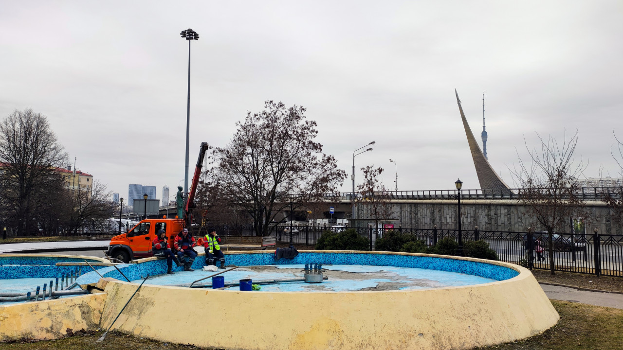 москва вднх городской пейзаж общественное пространство инфраструктура выставка россия люди прогулочная зона территория событие урбанистика Москва ВДНХ рабочие фонтан ремонт техника монумент Покорителям космоса культурное наследие Останкинская башня достопримечательность космос символ СССР городская среда улица ограждение транспорт зима деревья обслуживание инженерные работы мегаполис архитектураПохожие фотографии