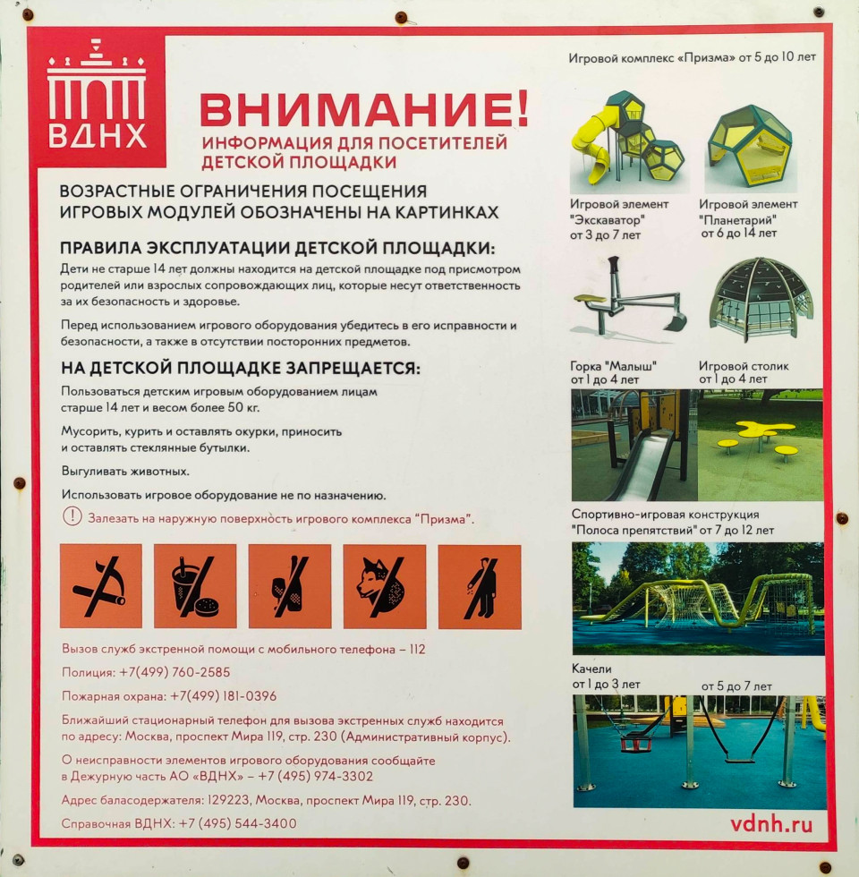 благоустройство детская площадка детские развлечения детский отдых детский досуг детское оборудование игровая зона игровое оборудование игровая площадка игровой комплекс развлечение физическая активность ВДНХ Москва информационная табличка правила детская площадка безопасность возрастные ограничения инструкция игровые элементы предупреждение инфраструктура урбанистика общественное пространство зона отдыха оформление рекреация навигация визуальная информация площадка дети родители городской парк благоустройство эксплуатация регламент безопасность детейПохожие фотографии